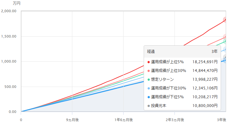 どうもこん○○わ! 白たぬです。2024年もあと少し、年末にサプライズはあるのかどうか。できればこのまま新年を迎えたいです。今回は、いつかは来るであろう暴落、それが新NISAの積み立て3年目、積立金額が1,000万円を超えたタイミングでやってきたら評価額はどうなるのか、シミュレーションしていきます。まず新NISA口座へ年間360万円フルMAXで積み立てできたとして、3年後の資産はこんな感じに増えているはず。(三菱UFJアセットマネジメント つみたて投資シミュレーションより)上図はオール・カントリー設定来のリターン・リスクをベースに算出しました。投資元本:1,080万円評価額 :1,400万円評価損益:+320万円(+29.6%)過去の実績をそのまま信じることは危険ですが、それでも再現性は高そうです。この状態からコロナショック級の暴落、今回は30%の暴落が起こった想定です。30%の暴落なので評価額は70%に下落し...評価額 : 980万円評価損益:ー100万円(ー9.3%)評価額が元本割れになります。どうでしょうか。30%の暴落と聞いても、何円下落するのかイメージが湧かないと思います。今回の様に1,400万円だった評価額が1ヶ月間で980万円にまで下落したら、しかも元本割れしたら、オール・カントリーを持ち続けることができるでしょうか。その答えは3年後。ぜひ自分自身で確かめてください。余談ですが...いつも資産形成のシミュレーションでお世話になっている三菱UFJアセットマネジメントの つみたて投資シミュレーション ですが、eMAXIS Slimシリーズのリターン値・リスク値を使用してシミュレーションが出来ます。しかも直近日付までの設定来のリターン値・リスク値となっていて、過去の実績を反映しているものです。(三菱UFJアセットマネジメント つみたて投資シミュレーションより)いつもはオール・カントリーのリターン値・リスク値を使用していますが、他の銘柄のリターン値・リスク値と比較してもオール・カントリーの実績は悪くないことが確認できると思います。まず・eMAXIS Slim 先進国株式インデックス・eMAXIS Slim 全世界株式(除く日本)・eMAXIS Slim 全世界株式(オール・カントリー)の3つを比較します。先進国株式インデックスの方がリターン値が小さいのは意外でした。オール・カントリーとの差は新興国の組み込みの有無だと思います。新興国の経済が足を引っ張るのではないか、と思っていたのですが。除く日本のリターンが少ないのは、円安の影響が無いからなのかな。オール・カントリーはこの中でリターン値が大きくかつ、リスク値が小さい銘柄でした。優秀です。次に・eMAXIS Slim 全世界株式(オール・カントリー)・eMAXIS Slim 米国株式(S&P500)の2つを比較します。S&P500の方がリターン値・リスク値ともに大きいですが、S&P500とオール・カントリーのリターン値、リスク値それぞれの増分の差を比較するとリターン値: 21.59 - 18.58 = 3.01%リスク値: 22.45 - 19.11 = 3.34%S&P500はオール・カントリーに対して3.01%のリターン増分に対して、それ以上の3.34%のリスクを負っていることがわかります。リスク値の差分が小さかったらS&P500の方が良い銘柄だと思います。S&P500の方がオール・カントリーよりもハイリスク・ハイリターンと言うことですね。S&P500のリターン値とリスク値の差、オール・カントリーのリターン値とリスク値の差分はぞれぞれどうなっているのでしょうか、差分の大きさも比較するとオール・カントリー: 18.58 - 19.11 = -0.53%S&P500: 21.59 - 22.45 = -0.86%結果、S&P500の方がオール・カントリーよりもリターン値に対するリスク値が大きいので、オール・カントリーは優秀な銘柄だと思います。皆さんの投資の第一歩の助力となりましたら、嬉しいです。