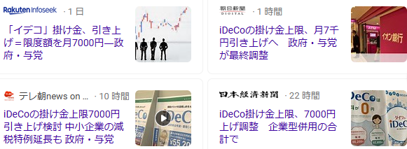 どうもこん○○わ! 白たぬです。またiDeCoのネタです。新NISAに負けじと、iDeCoもテコ入れするようですね。もともと増税メガネが公約にしていたのか、確かにiDeCoについても改革するって言ってましたね。それを石破内閣が引き継いだのでしょう。さて本題です。こちらのinfoseekの記事にあるように、来年度の税制改革で、iDeCoの拠出限度額を引き上げる検討に入るそうです。表にまとめるとこの通り...職業細目等変更前限度額変更後限度額公務員・会社員企業年金あり55,000円62,000円〃企業年金なし23,000円62,000円自営業(第1号)68,000円75,000円主婦(夫)(第3号)23,000円変わらず?白たぬは企業年金なしなので、月々23,000円から62,000円に増額。7,000円どころか、39,000円も上がるんです。記事のタイトルには引き上げ=限度額を月7000円と書いてますが、記事本文には企業年金のない会社員の場合は、イデコの掛け金上限額を現在の2万3000円から6万2000円に上げる方向だ。とも書いてあるんです。むしろこちらの金額を記事のタイトルにした方がキャッチ―じゃないのかい?どいつもこいつも皆一様に7,000円上がることを記事にしているけどさ。。。(ideco 拠出限度額 2025年度 税制改正の検索結果)記事の内容に統制が掛かっている様で、気味が悪いですね。2025年度の税制改革で方針が決定しても、適用されるのは早くて2026年1月からなのかな。どうせなら同時に、手数料削減の検討もして欲しいですね。iDeCoは出口戦略が複雑なのと、60歳まで引き落としできないから嫌煙されがちだけど、毎月手数料がかかることも利用者が増えない原因の一つであること、なんで気が付かないのかな。国民年金や厚生年金を開始する際、口座開設手数料を支払った記憶もないですし、なんなら毎月厚生年金を支払っているけど、その中に維持管理手数料が入っているなんて、聞いたことも無いです。なんで同じ「年金」なのに、iDeCoは手数料を国が搾取するのか、意味が分からないですよね。天下り議員の手当になっている、なんて考えたくもないですねぇ。拠出金額を上げた場合、どれだけの節税効果があるのか、それはいつかまた、シミュレーションしたいと思います。皆さんの投資の第一歩の助力となりましたら、嬉しいです。