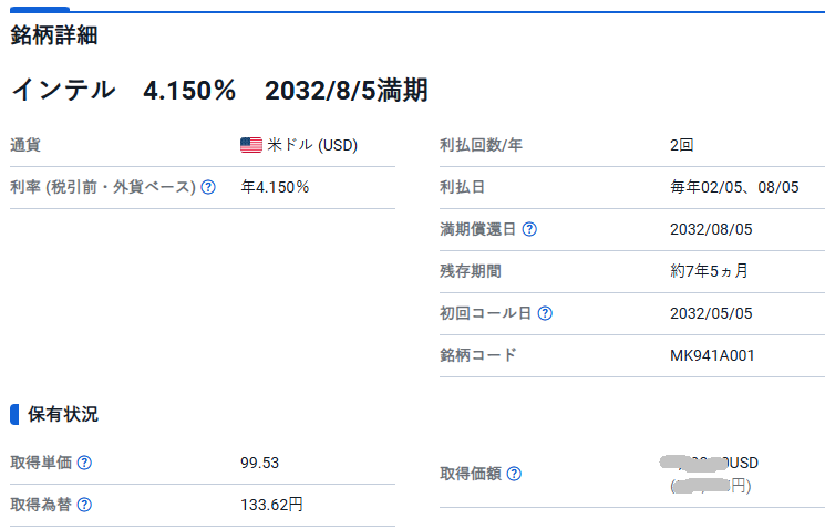 どうもこん○○わ! 白たぬです。今回は白たぬが保有している債券についてです。約2年前、投資を始めた頃は投資信託と債券を一定の割合で購入していました。投資信託はS&P500、オール・カントリー、VTIをそれぞれお試しで購入していたし、債券については個人向け国債か、外貨建てMMFか、米国債がいいか、外貨建ての社債がいいか、こちらも試行錯誤していました。その頃に購入した外貨建て社債の一つにインテルがありました。(SBI証券より引用)年利4.15%で年に2回利息が支払われるなんて、お得だと思いません?しかもインテルと言えば、そう、CPUのブランドじゃないですか。債券の購入当時、NVIDIAがこんなに台頭してくるなんて想定外だし、AIブームが来たとしても、GPUとCPUは市場が違うだろうし、これからもクラウドサービスが主流になるだろうからデータセンターやサーバー機器関連、特にCPUメーカーは安泰だろうと判断しました。それが今では経営状態が結構やばいようで、赤字を垂れ流しているんだとか。で仮に、インテルが他社に買収されたら、債券はどうなるんでしょう?紙くず?そこで調べてみました。結果、買収した会社が、インテルの債券の支払い義務を負うようです。ひとまず安心しました。今年こそくるぞ株式の暴落、と言われて早2年経過した気がします。景気悪くなったら金利が下がり、債券の価値が上昇する。なので、ポートフォリオ全体では資産の減少を抑える役割としても債券を持っているわけなんだけど、その債券自体がリスクになってしまっている状態です。外貨建て債券は社債ではなく、米国債の方が安心できそうだなぁ、と改めて思いました。と言っても債券は売らずに保有しときます。がんばれ、インテル!皆さんの投資の第一歩の助力となりましたら、嬉しいです。