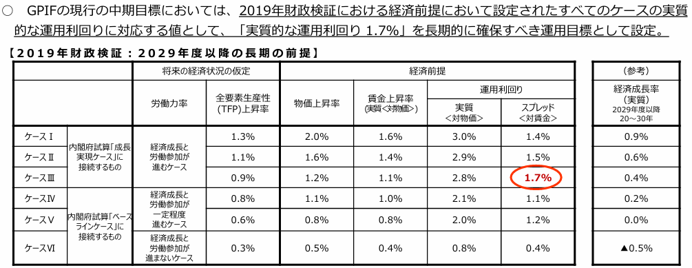 どうもこん○○わ! 白たぬです。最近、GPIFの実質運用利回りを1.9%に引上げるニュースを見かけたので、どんなものか調べてみました。詳細はGPIFの第24回社会保障審議会資金運用部会の「資料1 GPIFの次期運用目標等について」を参照■2019年の財政検証時の運用目標(過去の経緯)2019年の財政検証の際には、賃金上昇率を除いた今後10年間の実質運用利回り目標を1.7%としていました。なお賃金上昇率1.1%の妥当性については過去のブログ記事「【その他】年金を学ぶ ~GPIFと資産形成~」で、2001年度からの名目賃金上昇率を表にまとめているので参考まで。そして2020年には現在の様なポートフォリオ(国内株式25%、国内債券25%、外国株式25%、外国債券25%)に変更されました。■2024年の財政検証時の運用目標そして5年後の2024年、今年の財政検証の予想です。下から2番目が現在の景気を反映したもので、賃金上昇率も0.5%と低め。でも実質賃金のマイナス記録期間、結構長かったよね?こんなの、数字上はプラスなだけで、それよりも物価上昇率が高いから、まだ実質マイナスでしょう。■少子高齢化とマクロ経済スライド少し遡って2004年、時の政府は少子高齢化対策として、マクロ経済スライドを開始しました。要するに現役世代の負担上限①を決めたので、現役世代の人数によって、高齢者に分配出来る年金額④を案分しましょう、ってことです。少子化は高齢者のせいでは無いのに、政府の無策の責任を高齢者に負わせるのってどうなの?って思わなくもないです。そして現在のままでは2057年までマクロ経済スライドは継続しなければならない見込み。2057年...白たぬはその時、85歳。一生マクロ経済スライドかぁ...凹むなぁ。■現在のポートフォリオでGPIFの運用開始時からバックテスト(シミュレーション)した結果そこで1年でも早くマクロ経済スライドを終了するために、現在のポートフォリオで2001年からの市場実績と比較した結果がこちら。運用利回りの実績値、2.6%に対して、バックテスト結果の方が0.2%高い2.8%の利回りとなることがわかった。とは言え、上図の①~②の期間のバックテストのグラフの上下の振れ幅(リスク)を見てください。もともと①~②の期間のポートフォリオは国内債券に65%~72%も配分していたので、そりゃぁリスク低いよなぁ。。これ見ると、今のポートフォリオがリスクを抑えてリターンを最適化したとは思えないですね。で、運用利回りが0.2%高くなることが見込めるならば、賃金上昇率を除いた今後10年間の実質運用利回り目標も0.2%上昇して1.9%になるのではないか、という論理らしい。ポートフォリオを変えずに実質運用利回り目標を1.9%に上昇させたところで、何の意味があるのだろうか。。。あ、マクロ経済スライドの終了年を早められる可能性があるってことですね。上図の説明文だと、運用利回りが0.2%高くなれば、マクロ経済スライドの終了を3年早められるらしい。3年前倒しして2054年...白たぬはその時、82歳。結局一生マクロ経済スライドかぁ...凹むなぁ。■いままでの内容で、賃金上昇率の予想は出てきたか?でも、賃金上昇率はずっと0.5%固定の想定なのか?将来的に物価上昇率の目標を2%~3%にするのであれば、賃金上昇率もそれに追随することを想定しないとダメだよね。賃金上昇率のこと、考えてる?そこの考察はいったいどうなっているのだろう...■最後に...2001年からの「実質的な運用利回り」の平均はこちら。図の通り、過去23年間の実績の平均は+4.24%。2001年から20024年まで、ポートフォリオに紆余曲折あった末、結果的に+4.24%。え?現在のポートフォリオのバックテストの2.8%よりも断然好成績じゃない?今のポートフォリオって長期資産運用に本当に妥当なのかな?今後もGPIFに変化があったらまた考察したいと思います。皆さんの投資の第一歩の助力となりましたら、嬉しいです。