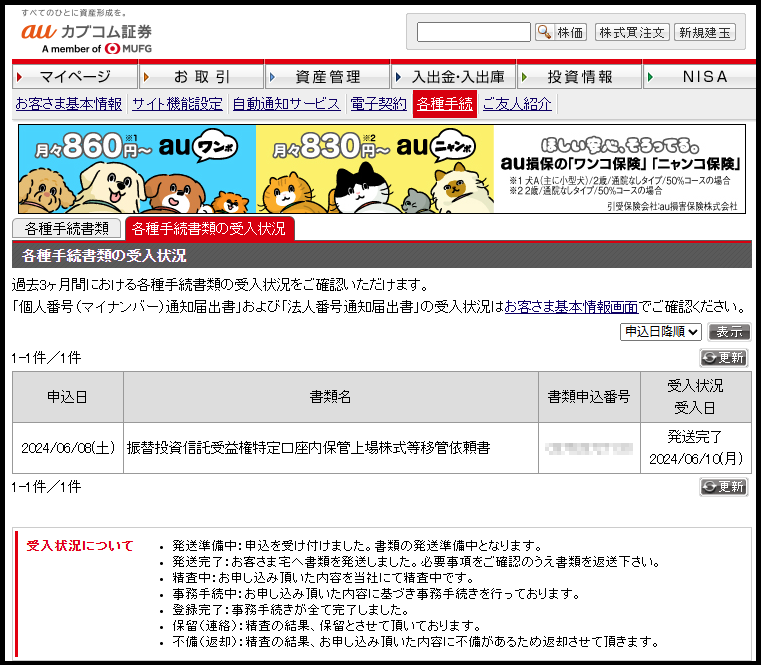 それにしてもauカブコム証券さん、手続き早いですね!