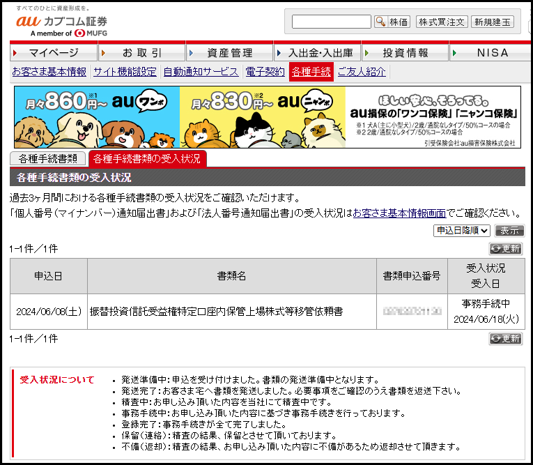 ■auカブコム証券にログインし、「設定・申込」>「各種手続書類の受入状況」を確認すると...