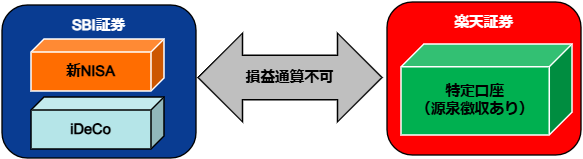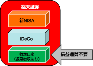 例外として、旧NISA・新NISA口座は利益に課税されないのでそもそも税金が引かれない。そのため、他の特定口座との損益通算ができません。