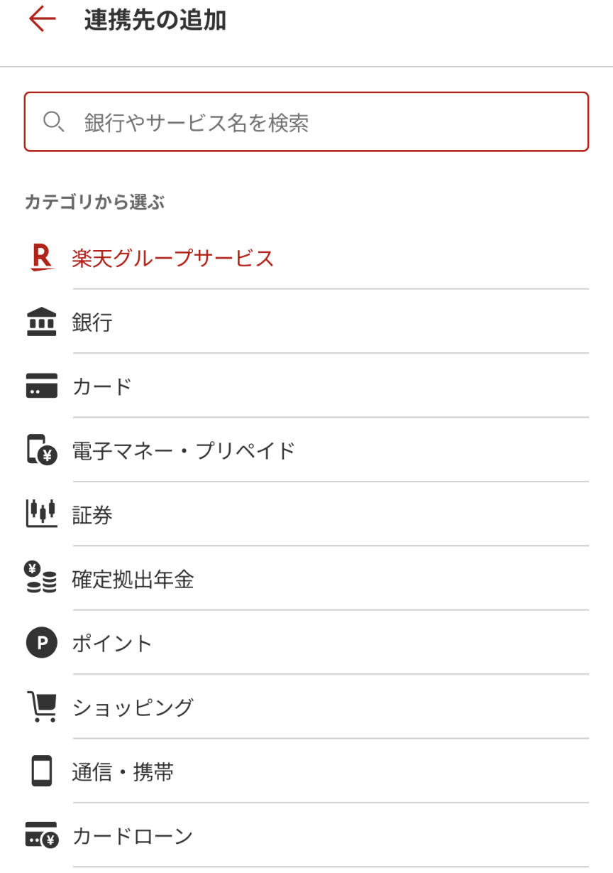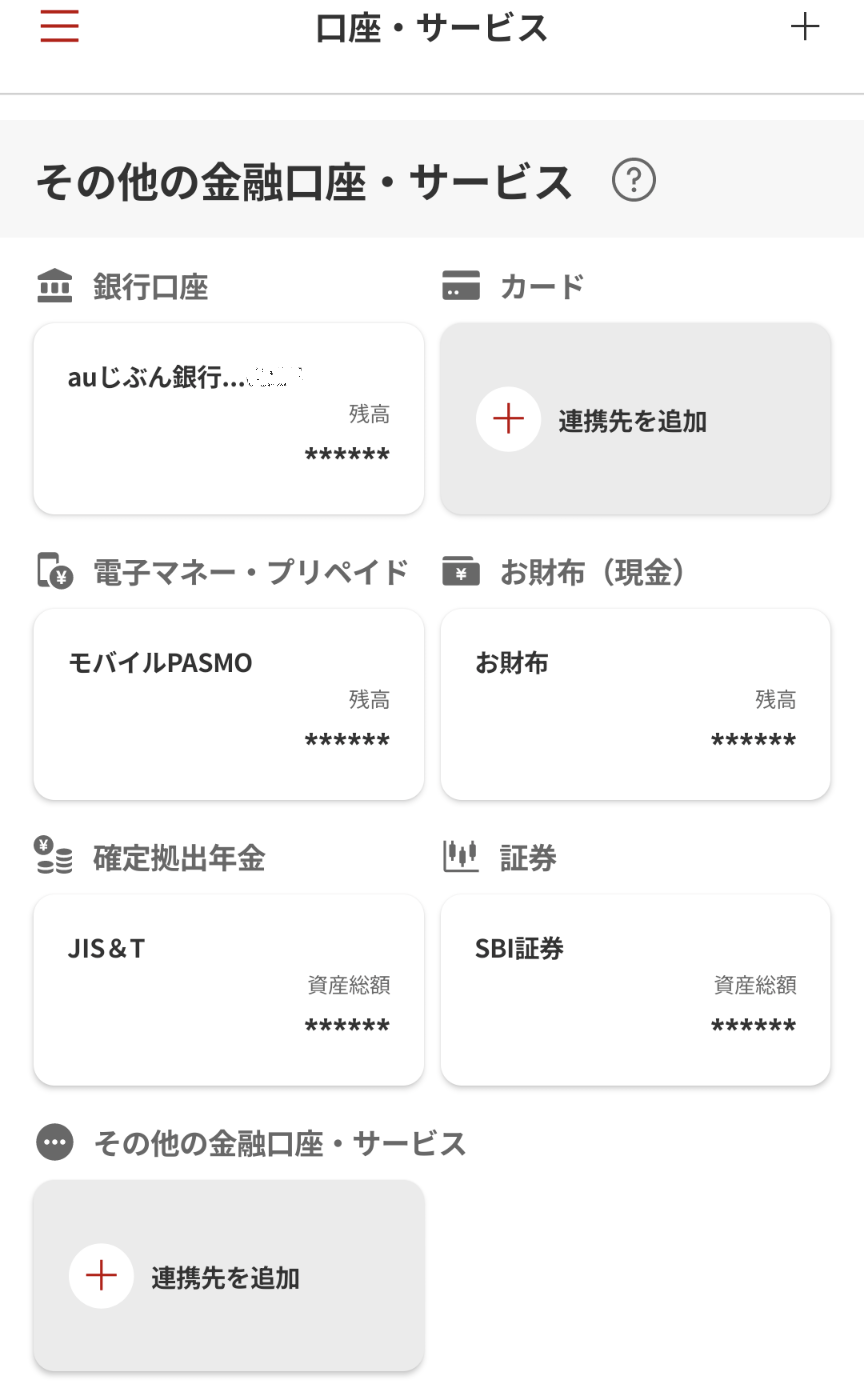 銀行口座、クレジットカード、電子マネー、証券会社、確定拠出年金、ポイントなど、連携したい口座は幾つかあります。