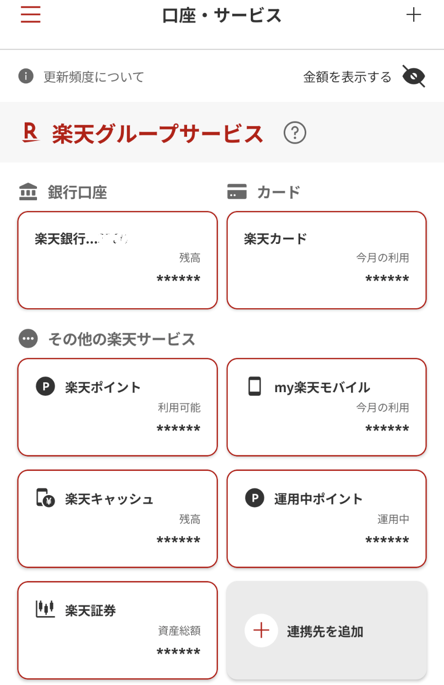 インストールして、楽天グループの口座と各種サービスの連携をしてみた結果がこちら。