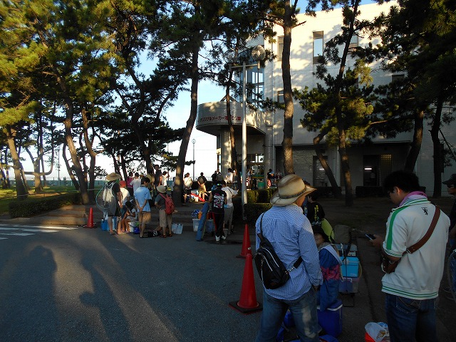 今日は親戚と市原市の養老川河口にあるオリジナルメーカー海釣り公園に行って来ました。オリジナルメーカーとは地元のスポンサー企業の社名だそうです。開場は6:00ですが、5:30でもこの行列でした。お盆休みなのでなかなかの人出です。岸壁から100m程沖に突き出した桟橋です。はじめての釣り場なのでワクワクしますね。桟橋はこんな感じで結構広々としています。床はエキスパンドメタルですので落し物に注意です。投げたエサがそのまま付いて戻ってきます・・エサ取りもいないのでしょうか?釣り座はこんな感じです。釣果は見事に何も釣れませんでした。完全ボウズです。この日は強風のため11:00で入場中止になりました。ちなみに中潮でした。