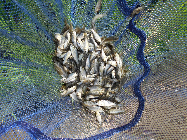 今朝のマブナ釣りです。朝でも既に暑いです。どこの釣り場に入るか迷うところですが、草深い所には入る気になりません。草が多い所は虫も多いですね。ニゴリが薄らいだのか、昨日より反応が良いような気がします。水際に小魚が群れて陸に跳ね上がってしまっています。バスか何かに追いかけられたのでしょうか?クチボソ系の雑魚が多く、いったん寄ってしまうと仕掛けが真面に落ちていきません。7月に入りここらの水田では農薬を空中散布しはじめたので、今後食いは落ちると思われます。釣りをしていると遠くに空中散布のラジコンヘリのプロペラ音が聞こえます。金色が入っている魚体を見るとキンブナではないか・・と思ってしまいます。エサはグルテンですが、気温が高くなると時間が経つに従い硬くなってしまうので、少量づつ作って使用した方が良いですね。今日の釣果です。反応が良く結構釣れたので、この倍数くらいは釣れたのですが、今朝はマブナ大脱走の日でした。エアポンプを使用したせいか、魚が頻繁に飛び跳ねて、勝手に川に戻って行きます。カバーをしているのに隙間から飛び出していくのだから驚きです。