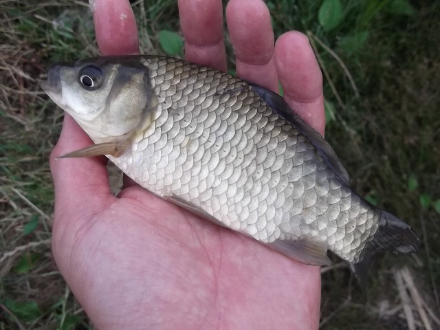 今朝は雨だったので、今日は午後のマブナ釣りです。遠くで雷が鳴っています。釣り場はこんなところです。すこし流れがあります。まあまあサイズのマブナが釣れました。うれしいです。コブナがメインです。針先が悪くなているようで底バレします・・早めに交換すれば良いのですが、面倒なのでそのまま続けます。これまた中ブナです。エサはグルテンです。キジの反応は良くありませんでした。今日の釣果です。中ブナが2尾釣れたので良しとします。雨が降り出したので撤収します。