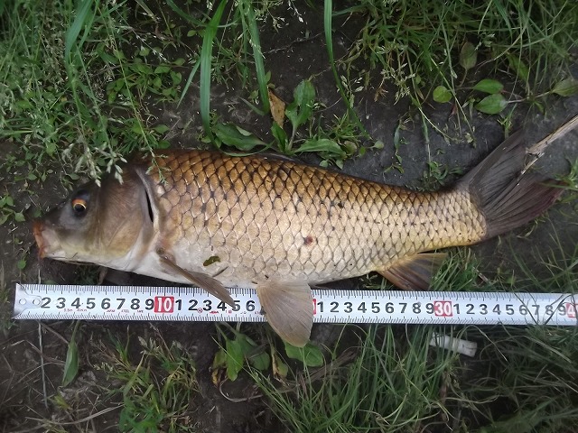 今日は圏央道を使って栃木県に出かけました。幸いに天気が好転しましたので、午前中で用事を済ませて、午後から釣り場を求めて水田地帯を彷徨いました。やたらコイが釣れてしまい、多くの仕掛けをロストしてしまいました。小ぶりのコイが何とか取ることが出来ました。川の流れが強いので、コイの引きが強いのでしょうか?久しぶりに尺上鮒が釣れました。なかなかの引きです。続いて35cmの尺鮒が釣れました。涼しい秋の風が吹いて、活性が上がっていたのでしょうか?時間をかけてもっと丁寧に探れれば良かったのですが、2時間しか釣れる時間がないので残念です。泣尺29cmです。道具は硬調先調子八尺、仕掛けは標準シモリ(1号五つ玉、早シモリ調整)、道糸1.2号ハリス0.8号、袖針5号。今日の釣果です。気温が下がったとは言え、まだまだ暑いので、バッカンごと川に放り込んで置きました。ひさびさに好漁でした。8月とは思えない満足のいく釣果です。