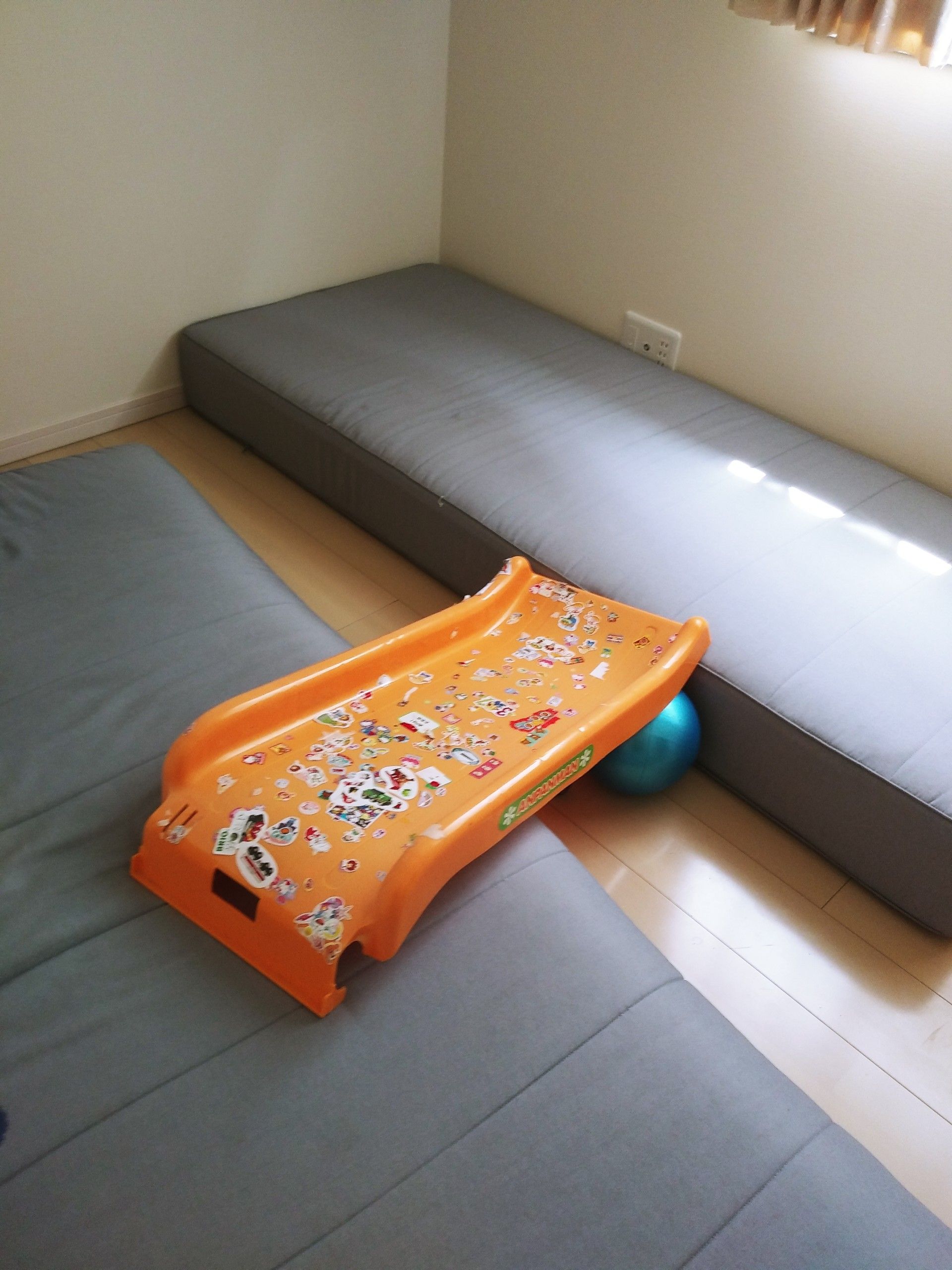 階段に持ってきて滑り台をして遊ぶのに使っています。
