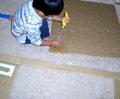 カズ(4歳3ヶ月)とのダンボールハウス作り、5日目。今日は 屋根の色塗りと取り付け です。このダンボールハウス作りには大張り切りのカズ。今日も 「屋根作ろうよ~!早く色を塗ろうよ~!」 とノリノリです☆絵の具(ポスターカラー)の準備をして、作業開始!カズは相変わらずの迷いの無さで 「青!」 と青い絵の具を選び、さっそく塗り始めました。作業はどんどん進み、あっという間に完成! 絵の具が乾いてから、この2枚の屋根をガムテープで繋ぎ合わせました。どの方向を上にするのか、ちゃんとカズに聞いて間違えないように繋ぎましたよ^^これを本体に上から被せるようにして、内側からガムテープで留めました。 取り合えず家の形はこれで完成☆でもまだまだ終わりません!(笑) 明日(6日目)は家の飾りつけです。