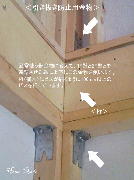 最近、ここ東海地方でも地震が頻繁に起こっています。ですから、この地方にお住まいの皆さんも少々不安に思っていらっしゃる方も多いことでしょうね。住宅建築の分野でも、耐震性を上げる努力は日々行われている。最近では耐震だけでなく免震というやり方もあるんですね。皆さんの家でも構造体を耐震化するなんてことは大変ですが、家具やテレビなんかを固定するなんてことなら出来るはずですので、是非少しでも取り組んで下さいね。さて、今回は知り合いの大工さんのおうちの現場を見せてもらった際に、面白い耐震金物を使っていたのでご紹介します。それが、これ。1Fの壁と2Fの壁とを上と下から緊結させてしまうという耐震金物。直接的につながっている訳ではありませんが、桁(ケタ)を介して引っ張り合っているんですね。そして、私たちがいつも使っているのが、この帯金物。写真では、1Fの床根太と1Fの壁とを帯金物を使って緊結させようとしているのが、分かりますよね。それぞれ形は異なりますが、その考え方は共通しています。そう、地震の際に上下に揺さぶられて、柱や床を引き抜こうとする地震の力を抑止するのが狙いです。金物に使われる金属も粘りのある素材が使われていますのでそれ自身が断裂するようなことはありません。どこまで力が掛かるかによって、硬軟使い分ける構造が一番いいように思いますが、如何でしょうか。