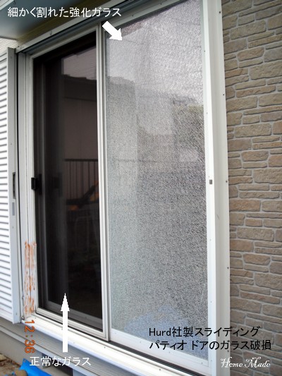 ガラスに細かなレースのカーテンが掛かっているようにも見えるパティオドア。でも、左隣のガラスには、カーテンのようなものも何も映り込んでいませんよね。実は、右側のガラスは、細かいクラックがガラス全体にビッシリ入っている為に、レースが掛かったように見えているのです。自動車のガラスと同様に、割れてもガラスが鋭利な形状にならず、細かな粒状となるのが強化ガラスなのです。通常、輸入サッシのパティオドアには、強化ガラスが二重に入っています。それは、誤って人間がガラスにぶつかっても割れないようにする目的と、こうして何らかの原因でガラスの1枚が破損しても、残りのガラス1枚が防犯・防水の役割を担ってくれるように考えられている為です。(強化ガラスは、先端の丸いバットのようなものでは簡単に割れません。だから、人間がガラスに突っ込むような状況になっても、人間の方が打撲するだけで破損による大きな事故にはつながらないのです)勿論、ペアガラスにすることによる断熱効果も期待されていますが、更にこちらの窓にはLow-Eという熱線反射フィルムがガラスに組み込まれていたのです。(私たちが輸入するサッシには、ほぼ標準的にこの機能が付加されています)それによって、ガラスが飛散することなく、フィルムに付着した状態を保っているようです。よくご覧頂くと左端には国産の雨戸も見受けられますので、こういう状況ではガラスの交換自体に緊急性はありません。そういう点でも、本当に輸入サッシは素晴らしいと思います。ただ、このお客様の家には、メンテナンスをしてくれるビルダーがいないという大きな問題がありました。新築施工をしたビルダーは、輸入住宅ブームの時に新しく2x4の建築を始め、数件手掛けてからこの仕事から撤退してしまったらしいのです。それ以来、この設計・施工会社は何も対応してくれなくなり、まさに放置された状態でした。こういうことが本当に多いというのが、日本の住宅産業なんです。つまり、お金になりそうなことにはすぐに飛びつくけど、面倒や手間が掛かることからは逃げてしまうんですね。ハードに限らず、アンダーセンやウェザーシールド、ウィルマーやインシュレート、マービンなどという輸入サッシは、取扱いしている住宅メーカーが極端に少なくなっていますし、メンテナンスや補修にはそれなりの知識と経験が必要となります。このお宅は、私共が手掛けたものではありませんが、輸入住宅の本当のよさを感じて欲しいという私共の思いは、変わりません。手間が掛かって、決して割に合うような仕事ではありませんが、こういうお客さんに対し、私たちが知らない顔をすることは絶対にありません。それは、私たちの高い志に起因するものです。目には見えませんが、これがあるのとないのとでは建てたおうちの寿命が変わってくるはずです。