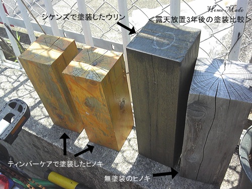 2009年9月から始めた木材の暴露テスト。2年半が過ぎましたがさて、最近の状態はどうかと見てみました。会社の前に放ったらかしにしているだけなので、何もやっていないのですが、どの木材も意外といい状態を保っているようです。特に南洋材で非常に堅いウリンは、きっとシケンズの塗料は剥がれて機能しなくなっているだろうに、多少汚れや割れが入っていますが、元の状態を保っています。また、パラペイントの木材保護塗料「ティンバーケア」で塗装したヒノキは、さすがに塗料が剥げてきてはいますが、全く塗料が剥げていない面も残っており、割れもまずまずな気がします。一番劣化があると予想した無塗装のヒノキですが、もう腐ってくる頃かと思いきや、こちらも意外と頑張っています。多分、どの木も雨に晒されてはいますが、日当たり良好な場所なのですぐに乾いた状態になるので、腐朽菌が繁殖しにくいといった感じなのかも知れません。また、コンクリートのブロックは吸水性があるので、水分を下に落としてしまい、木の下に水たまりが出来ないという点も木にとっては好都合なのでしょうね。塗装といった工夫と、日当たりといった環境の両方をちゃんと考えてやれば、ウッドデッキなどでも随分と長持ちするはずですが、そういったおうちが少ないのは何故でしょうねぇ?