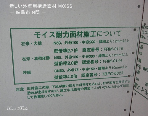 2x4工法(枠組み壁工法)は、外壁部分全体に構造用合板を貼ることで耐震強度を上げる工夫をします。通常使われる9mm厚のものでなく、ホームメイドでは強度の高い12mmのものを使います。コストよりも品質を重視する姿勢がここにも表れています。レンガ積みの外装を予定している岐阜のこの現場でも同様の施工をしようと考えていたのですが、確認申請の際にカナダ製のレンガは、防火認定がなされていないので、外壁ラインに防火材を入れるように指導があった。こちらの主張は言いましたが、ここでケンカしても仕方のないことなので、素直に聞き入れましたが、厚さ90mmもある焼きレンガ(カナダのレンガはアフリカのような日干し煉瓦じゃないですよ)が、耐火材じゃないなんてナンセンスも甚だしいですよね。「燃やせるもんなら、燃やしてみろよ。燃やして崩れるかどうか、試してみろよ」なんて言いたいです。まあ、お役所仕事なんてこんなもんですが、日本で認定されていないものは、カナダで防火材であっても認めないという態度は、非関税障壁以外何ものでもありません。さて、そこで私たちは、国内で新しく開発されたMOISSという壁用耐火面材を、構造用合板に代えて採用しました。MOISSの主成分は、バーミュキライトという天然の粘土鉱物で、厚さは9.5mm。12mmの構造用合板と比べると少し薄いですが、強度計算上は下記のように同等となります。厚12mm構造用合板/釘CN65/釘間隔@100mm: 4.0の壁倍率厚9.5mm MOISS/釘CN50/釘間隔@75mm: 4.0の壁倍率これを見ると、MOISSの方が、細くて短い釘をたくさん打ち、柱材と面材とを更に一体化させて強度を出していることが分かりますね。因みに、通常の住宅メーカーが施工する2x4住宅だと下記倍率しかありません。(木造軸組工法は、更に低い値となる傾向にあります)厚9mm構造用合板/釘CN50/釘間隔@100mm: 3.0の壁倍率あと、MOISSのいいところは、吸放湿作用性能があり、有害物質を吸着させる効果があるというところです。こうしてみると、MOISSはいいことばかりのようですが、価格もそれなりに高くなります。また、新しい素材故に、長期使用時の劣化度合いも不明ですので、今後どうなるかを注視していかなければなりませんね。まあ、どんな素材を使っても、長所も欠点もありますからそれを見極めてどれを施工するかを決めたいものです。そうそう、面材に釘を打つ時は、釘の頭が深くめり込まないようにすること、間隔を明けないこと、所定の釘であることが強度を上げる必要条件となります。今回は、ちょっとだけアカデミックな内容でしたね。