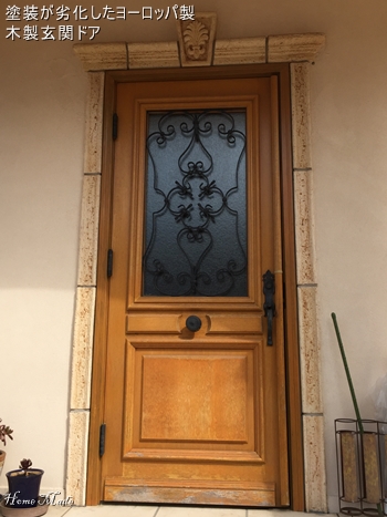 愛知県西尾市のお客様から、塗装が劣化したヨーロッパの木製玄関ドアの塗り直しのご相談を頂きました。細工や装飾もしっかりされていて、南欧的なデザインがよく出た美しい玄関ドアです。きっと、当時はお値段も高かったでしょうね。こちらのドアを製造した欧州のメーカーは、既になくなってしまったような気がしますが、私たちのような処がちゃんとメンテナンスすれば、長くお使い頂けると思います。恐らくここの玄関ドアは、庇(ひさし)がある程度ある場所に設置されていると思いますので、ドアの上部についてはそれ程塗装の劣化はないようです。ただ、下の方は塗装の剥がれが進んできているようですから、今のうちに対処しておくことが必要です。また、気密・防水の為のウェザーストリップの劣化もありますので、そういった部分も一緒に交換した方がよさそうです。いいものは、放っておいても長持ちするというのは間違いです。手入れやメンテナンスをすれば長くクオリティを維持出来るのが、いいものなんです。どうぞ今後も大切になさって下さいね。輸入住宅の新築やメンテナンス、コンサルやコーディネートをして欲しい、私と話をしたいという方は、お問い合わせ下さい。全国どこでもご相談を受け付けます。尚、相談や問い合わせの前には、日々更新する記事をいくつかご覧の上適否をご判断願います。