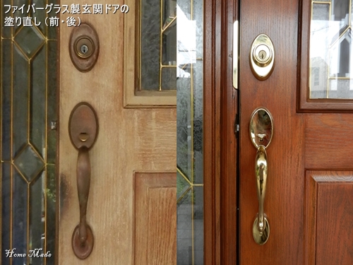 木製輸入ドアのように激しく劣化することはないですが、ファイバーグラスの玄関ドアも表面の塗装は10年もすると悪くなります。写真左が劣化して白く塗装が剥げた状態ですが、ファイバーグラス自体は全く問題ない状況なので、写真右のように専用塗料で正しく塗り直せばこのように美しい木目が蘇ります。まるで新品のようで、信じられないくらい美しいでしょ。一般の皆さんだけでなく、建築業者さんでもきっと木製ドアと見間違えるのではないでしょうか。でも、ドアの塗装だけでなく、10年もするとドアの金物も劣化してきます。鍵のデッドロックやドア・ハンドル、ヒンジといったものも雨風に曝されて錆び付いてしまいますよね。最近ではライフタイム・ワランティと呼ばれる錆びない金物が登場していますが、それでもヒンジが長期の使用で減ってしまったり、鍵が固くなったり、ハンドル・レバーのバネが利かなくなったりしているかも知れません。玄関ドアは家の顔。ファイバーグラスでも木製でも、塗装をする時はドアの金物類も一緒に交換すると気持ちよく住めるようになりますよ。輸入住宅の新築やメンテナンス、コンサルやコーディネートをして欲しい、私と話をしたいという方は、お問い合わせ下さい。全国どこでもご相談を受け付けます。尚、相談や問い合わせの前には、日々更新する記事をいくつかご覧の上適否をご判断願います。