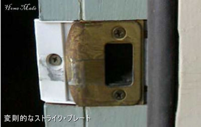 とあるお客様から、勝手口のドア枠を交換するのでドア・ラッチの爪が入るストライク・プレートも交換したいという相談を頂きました。金属のストライク・プレート自体は、それ程特別ではないのですが、ドア枠が大きいせいか白いストライク・プレートが継ぎ足されています。恐らく何かの必要性でドア枠を外側に足した為に、ストライク・プレートの奥行も足らなくなったのでしょうね。こういう場合、北米では奥行が深いタイプのストライク・プレートも販売されていますので、そういったものを調達すればいいのですが、日本にはそういったものがないので、建てた工務店さんが工夫をしたものと思います。それにしても、こんなストライク・プレートの付け方は初めてです。まあ、今まで特に違和感もなく使えてきたのでしょうから、これはこれでいいのかも知れません。輸入住宅の新築やメンテナンス、コンサルやコーディネートをして欲しい、私と話をしたいという方は、お問い合わせ下さい。全国どこでもご相談を受け付けます。尚、相談や問い合わせの前には、日々更新する記事をいくつかご覧の上適否をご判断願います。