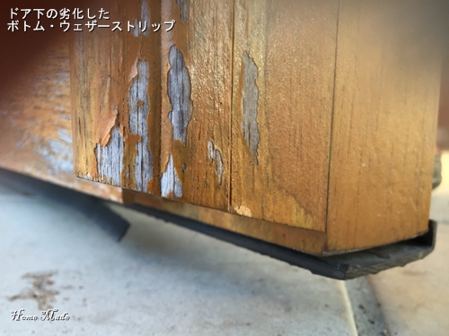 こちらは、木製玄関ドアの下端のアップ写真です。木の塗装も随分劣化してきていますが、ドア下に取り付けられたゴム製の気密・防水パッキン材であるボトム・ウェザーストリップも同様に外れてきています。新築時から塗装もパッキン材もやり替えていないでしょうから、ドアの塗り直しと一緒にこの黒いウェザーストリップも交換した方がよさそうです。いいものを長く使いたいのであれば、お客様自身も常にいい状態に保つ努力をしていかなければなりません。ご自身でメンテナンスが出来ないようであれば、私たちのような専門家の手を借りて補修をしていくことも必要です。輸入住宅好きの皆さん、どうぞ家を大切になさって下さいね。輸入住宅の新築やメンテナンス、コンサルやコーディネートをして欲しい、私と話をしたいという方は、お問い合わせ下さい。全国どこでもご相談を受け付けます。尚、相談や問い合わせの前には、日々更新する記事をいくつかご覧の上適否をご判断願います。