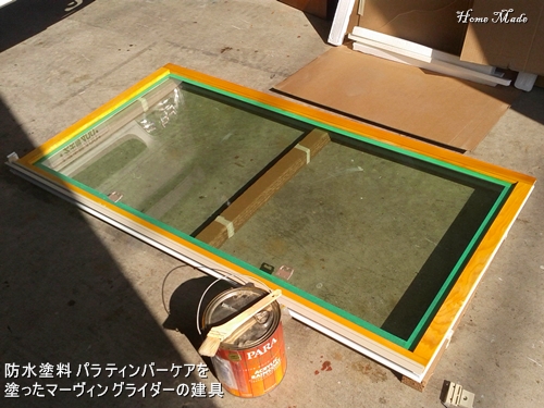こちらは、アルミクラッドの木製輸入サッシ マーヴィンの建具(障子)。グライダーと呼ばれる引き違い窓なんですが、高さが1.3m、幅が70cmもある大きな建具です。一見エスニックにも感じる色遣いですが、それは塗装する為に緑色のマスキングテープをガラスの周囲に張ってあるからです。この建具は、交換用にアメリカから調達したのですが、室内側の木部は無塗装でしたのでパラペイントのティンバーケアを塗って防水処理を施しました。今回この建具に交換することになったのは、既存のグライダーの窓ガラスにヒビが入ってしまったからなんですが、マーヴィン(Marvin)の多くのサッシはガラスのみの交換が難しいのが実情です。また、輸入サッシで同じものを調達するのは、結構大変です。窓のサイズを計測し、施工時期や窓の品番なども確認しなければなりません。勿論、窓の交換方法も分かっていなければいけませんから、専門知識がない建築屋さんなどではお手上げ状態だと思います。輸入住宅の新築やメンテナンス、コンサルやコーディネートをして欲しい、私と話をしたいという方は、お問い合わせ下さい。全国どこでもご相談を受け付けます。尚、相談や問い合わせの前には、日々更新する記事をいくつかご覧の上適否をご判断願います。<関連記事>: 窓ガラスって自然に割れるの? (2015年12月4日)