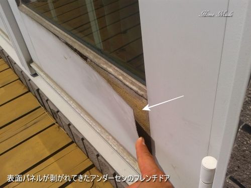 こちらは、アンダーセン(Andersen)製の両開きフレンチドア。ガラスには飾り格子も入っていて、豪華なテラスドアです。築19年という比較的新しい輸入住宅ですが、こちらのドアの表面パネルがご覧のように剥がれてきてしまいました。表面パネルは、薄い化粧板の上に塗装が施してあるのですが、接着面が剥がれて下地の木部が露出しています。以前応急処置で地元の大工さんがパネルを接着剤で張り直して、木口部分にコーキングを塗って防水処理をしてくれたらしいのですが、うまく施工が出来ていなかったのか、パネルがまためくれてきています。こうなってしまうと、下地の木部やペアガラスの下端にも雨が入ってしまい、室内側の木部パネルもめくれた状態になってしまいます。お客様はまた接着剤で張り直せないかという感じでおっしゃっていましたが、パネル自体が反ってしまっているので、どこかが浮いた感じになってしまい、すぐに雨漏れすることとなってしまいます。メーカーにも一度対処方法について相談してみようと思いますが、恐らくこうなってしまうとドア自体を交換する以外にないかも知れません。アンダーセンのスライディング・パティオドアやフレンチドアは、表面材が木質パネルになっているので、パネルのつなぎ目やガラスとが接する部分には定期的に防水処理をしなければなりません。外壁を塗り替えする際には、輸入のサッシやドアの防水処理や塗装をすることを忘れてはいけません。そういうことを知らない住宅メーカーや工務店も多いですから仕方がありませんが、私の記事を読んで頂いている皆さんは、どうぞお気を付け下さいませ。輸入住宅の新築やメンテナンス、コンサルやコーディネートをして欲しい、家全般のチェックやアドバイスを受けたいので、現地調査を希望するという方は、お問い合わせ下さい。全国どこでもご相談を受け付けます。尚、相談や問い合わせの前には、日々更新する記事をいくつかご覧の上適否をご判断願います。また、これらの記事が、多くの皆さんのお役に立てて頂ければ幸いです。