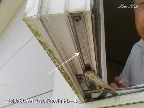 こちらは、アルパイン(Alpine)製ケースメント樹脂サッシの建具を下から撮った写真です。いかにも屋外から撮影したように見えますが、実は手を伸ばして自撮りをする要領で写真に撮りました。こちらは、窓を開閉する為のオペレーターに不具合があって、そのオペレーターがどういった形状をしているかを確認する為に撮ったのです。建具の樹脂枠には、相当水気が溜まっていたのか、緑のコケのようなものが付いています。オペレーターが壊れていたので、きっとあまり窓を開けられなかったのでしょうね。こうした写真などでオペレーター等の金物類は特定出来たのですが、写真の矢印の部分のガイドレールが「コの字」の形状をしているのが分かりますでしょうか。この「コの字」の部分をオペレーター・アームが前後に動いて窓を開け閉めするのですが、ガッチリ「コの字」で挟まれているので、オペレーター・アームをレールから外そうとする際には、まずレールを建具から外さなければなりません。ただ、レールを固定しているビスが、建具の下の両サイドに付いているので、室内側から身を乗り出してビスを外すことは出来ません。つまり、2階にこの窓が付いていると、外部足場を立てて屋外側から建具のビスを外すしか方法がないのです。だって、もし室内側から感覚だけでビスにドライバーを差し込められても下手をするとビスを下に落としてしまい、失くさないとも限りません。ケースメントの開閉金物を外したり取り付けたりするのに、室内で作業が出来ないというパーツは初めて見ました。こりゃ、普通のリフォーム屋さんや住宅メーカーでは、歯が立たない仕事かも知れませんね。輸入住宅の新築やメンテナンス、コンサルやコーディネートをして欲しい、家全般のチェックやアドバイスを受けたいので、現地調査を希望するという方は、お問い合わせ下さい。全国どこでもご相談を受け付けます。尚、相談や問い合わせの前には、日々更新する記事をいくつかご覧の上適否をご判断願います。また、これらの記事が、多くの皆さんのお役に立てて頂ければ幸いです。