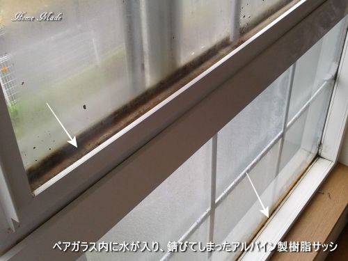こちらは、豊田市にある賃貸輸入住宅に取り付けられたアルパイン(Alpine)社製樹脂サッシです。上下にサッシを組み合わせた大きな複合サッシですが、そこに使われているペアガラスが全て内部結露を起していました。不具合が起きてから随分時間が経っているのか、ガラスの中は随分曇っていますし、ガラスの周囲の金属スペーサーも相当錆び付いています。アルパインというサッシ・メーカーは、国内では手に入らない状況となって久しいですが、サイズに合わせてガラスを特注すれば、元通りに戻ります。大家さんもいろいろ管理会社に相談したようですが、輸入サッシを直せる人間が見つからず、店子のお客様から相当クレームを頂いていたようです。私たち ホームメイドは、こうしたトラブルを全て修理することは可能ですが、このサッシは外側からしかガラスを外すことが出来ませんし、それもハメ殺しのFIX窓が2階に2つもあるので、外部足場を組まなければガラスの詳細寸法も確認出来ませんし、交換作業も不可能です。そういった意味では、特注ガラスの調達だけでなく、施工の費用も結構掛かりますから、それまでしてメンテナンスをするかどうかは、大家さん次第ですね。輸入住宅の新築やメンテナンス、コンサルやコーディネートをして欲しい、家全般のチェックやアドバイスを受けたいので、現地調査を希望するという方は、お問い合わせ下さい。全国どこでもご相談を受け付けます。尚、相談や問い合わせの前には、日々更新する記事をいくつかご覧の上適否をご判断願います。また、これらの記事が、多くの皆さんのお役に立てて頂ければ幸いです。