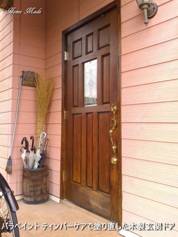 今日は、瀬戸市で木製玄関ドアの塗り直しを行いました。随分前に作業をすることになっていたのですが、この長雨のせいで順延となっておりました。表面の劣化した古い塗装や汚れを紙ヤスリ等で剥がし、その上からパラペイントの屋外用木部専用防水塗料 ティンバーケアのナチュラルクリア色を2度塗りました。部分的に木が削れて無塗装の状態になっていた処もありましたので、そこだけタッチアップで着色塗料を塗りました。まだ完全には乾いていない状態で写真を撮りましたから、少し色が濃いめに写っているような気がしますが、明日にはもっとナチュラルな感じに落ち着いてきていると思います。ドアの下の方は少し白ボケした感じになっていますが、木自体が少し劣化している状態なので、色が変わってみえるのは仕方ないですね。何れにしても、これで雨がドアに当たっても水を弾いてくれますし、太陽の紫外線からも木部を守ってくれますから、5~10年くらいは塗り直しをしなくていいかも知れません。こうして定期的にケアしてあげれば、木製ドアでもずっと使い続けられますから、どうぞ皆さんもやってみて下さいね。輸入住宅の新築やメンテナンス、コンサルやコーディネートをして欲しい、家全般のチェックやアドバイスを受けたいので、現地調査を希望するという方は、お問い合わせ下さい。全国どこでもご相談を受け付けます。尚、相談や問い合わせの前には、日々更新する記事をいくつかご覧の上適否をご判断願います。また、これらの記事が、多くの皆さんのお役に立てて頂ければ幸いです。