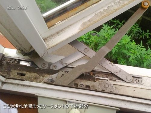 こちらは、古いミルガード(Milgard)社製ケースメントサッシの開閉金物部分のアップです。建具(障子)部分のペアガラス内にも錆びがあり、その樹脂枠にも汚れと結露が混ざって乾いた跡が見受けられます。また、左右にスライドするウィンドウヒンジやオペレーターといった部分にも随分ホコリやゴミが散見される状況です。こんなに汚れが溜まった状況では、窓の開閉がうまくいかないのは皆さんでもお分かりでしょう。最近の輸入住宅は高気密・高断熱。冬は暖房、夏はクーラーを使い、殆ど窓を開けないというご家庭も多いと思います。でも、そうすると建具と窓枠との間に雨や湿気が溜まるばかりか、外の砂や枯れ葉、排気ガスの油なども入り込んだまま抜けなくなります。因みに、製鉄会社がある愛知県東海市などは、鉄粉も飛んできますから新築後まもなくでもサッシの塗装の劣化や金物の錆びなどが発生します。家の中の掃除をこまめにするというお客様でも、窓を開けてサッシの金物部分まで掃除をするという人は殆どいません。こうした手入れをしないまま窓を使い続ければ、窓の金物がスムースに動かなくなるばかりか、錆付いてギアなどが欠損したりもしますし、建具の水平・垂直に狂いが生じサッシが閉まらなくなったりします。輸入サッシは不具合が起りやすいなんて話をする人がいますが、それはご自身が手入れをしていなかったことを棚に上げているだけのこと。小さなハケや歯ブラシを使って細かな処まで掃除をした後に、シリコンスプレーを可動部に差してあげれば、そう簡単には悪くならないのが輸入サッシです。勿論、長く使っていると防水処理が切れてきたりしますから、そういう時には私たちのような専門ビルダーに相談して、処理のやり直しをしてもらうようにすれば、ペアガラスの曇りや結露のトラブルも回避出来ます。今回の台風が去ったら、窓を開けて掃除をしてみては如何でしょうか?輸入住宅の新築やメンテナンス、コンサルやコーディネートをして欲しい、家全般のチェックやアドバイスを受けたいので、現地調査を希望するという方は、お問い合わせ下さい。全国どこでもご相談を受け付けます。尚、相談や問い合わせの前には、日々更新する記事をいくつかご覧の上適否をご判断願います。また、これらの記事が、多くの皆さんのお役に立てて頂ければ幸いです。