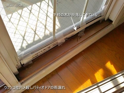 こちらの写真は、ウェンコ(Wenco)社のスライディング・パティオドア(掃出しサッシ)に追加されたハメ殺しのサイドライト。外から見ると3枚ドアの掃出しサッシに見えますが、南側に面した日当たりのいいバルコニーに設置されています。日当たりがいいということは、逆に言えば台風の雨風が最も強く当たる場所と言っても過言ではありません。そんな場所に雨仕舞があまりよくないウェンコの窓が取り付けられている訳ですから、何も対策を取らなければ雨漏れするのは必至です。案の定、窓ガラスとアルミの下枠との間から雨が木製フレームに侵入し、中から木を腐らせていきました。中から腐っていきますから、それが人の目に触れるような状態になるまでにはその腐り方は相当なものになっています。お客様ご自身も何とかしなければと考えて、養生用のビニールテープを外側や室内側に張って防水や枠補強をしたようですが、不十分な仕事では中に入った水が外に出にくくなるだけで、反って腐るのを助長させるだけでした。どうにか腐った下枠だけを交換する方法はないかとも考えましたが、構造的に雨仕舞が悪い状況を変えることは出来ませんし、建具部分の枠だけでなく本体側の枠にも損傷がある状況ではサッシ自体を交換する以外に抜本的な対策はありません。バルコニーは、雨や風が滞留しやすい場所ですから、防水がしっかりしたサッシを取り付けることが大切ですが、定期的に防水メンテナンスを実施することはもっと大事だと思います。輸入住宅の新築やメンテナンス、コンサルやコーディネートをして欲しい、家全般のチェックやアドバイスを受けたいので、現地調査を希望するという方は、お問い合わせ下さい。全国どこでもご相談を受け付けます。尚、相談や問い合わせの前には、日々更新する記事をいくつかご覧の上適否をご判断願います。また、これらの記事が、多くの皆さんのお役に立てて頂ければ幸いです。