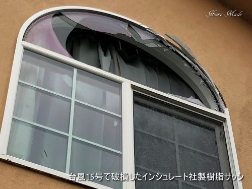 こちらの写真は、台風15号で破損したインシュレート(Insulate)社製樹脂サッシ。(もしかしたら、サーティンティード製かも・・?)ハーフサークルのラウンドトップが付いた片引きの引き違い窓ですが、ご覧の通り台風の風でペアガラスが破損しています。今回の台風19号は雨台風だった為か、これ以上の被害はなかったようですが、未だに修復が出来ていない状況です。こちらのおうちは千葉県にあるのですが、近くに輸入住宅を触れるビルダーさんがいないということで、私共にご相談を頂きました。当初は、ガラスを採寸してこの輸入サッシに納まるペアガラスを製作・入れ替えをするだけと考えていましたが、よく見るとガラスの周囲の樹脂枠も破損しています。樹脂枠にはガラスを固定する為の戸当りのような役目がありますから、この破損でその役割が果たせなくなっていないかが問題となります。また、こうした機能を持った窓枠の裏側には、ガラスを外したり挿入したりする為に取り外し可能なガラス押えと呼ばれる固定部材が取り付けられているはずですが、それも破損したり、どこかに飛んでいって紛失してしまっていないかが不明です。お客様からこうした写真をいくつかお送り頂いているのですが、2階の高い位置にあるサッシであるのと割れた部分には既に防水用のビニールシートが張ってある為に、お客様では重要な部分の写真を撮ることが出来ないようです。お客様は最悪サッシ全体を外壁から外して交換することも考えているようですが、そうなるとサッシの周囲の外壁や室内側の壁も触る必要が出てきますから、工事としても相当大きなこととなってしまいます。大工さんやペンキ屋さん、左官屋さん、サイディング屋さんといった職人を一緒に連れていくというのは、名古屋からではちょっと無理がある気もしますから、現地で信頼出来る業者さんにお願いすることも考えなければなりません。そういった点では、ガラスとその周囲の部材の交換だけで済ませることが一番ですが、それらを装着出来る状態なのかやそういった部材を調達することが出来るかなど、1つ1つ課題をクリアしていかなければなりません。ちょっと手間は掛かると思いますが、一度現地調査をさせて頂いて現在の状態をチェックすることが、まずやるべき私の仕事のようですね。でも、今回の台風で被害を受けた輸入住宅は、相当あるでしょうから、今後こうした難題のご相談が増えるかも知れません。私たちは全力で復旧のお手伝いをさせて頂くつもりですが、小さな名古屋の輸入住宅ビルダーでは手が足りない状況となるかも知れません。今後、毎年こうした猛烈な台風や豪雨、竜巻や洪水、地震や津波といった自然災害が何度も襲ってくるでしょうから、日本はどうなってしまうのか心配でなりません。輸入住宅の新築やメンテナンス、コンサルやコーディネートをして欲しい、家全般のチェックやアドバイスを受けたいので、現地調査を希望するという方は、お問い合わせ下さい。全国どこでもご相談を受け付けます。尚、相談や問い合わせの前には、日々更新する記事をいくつかご覧の上適否をご判断願います。また、これらの記事が、多くの皆さんのお役に立てて頂ければ幸いです。