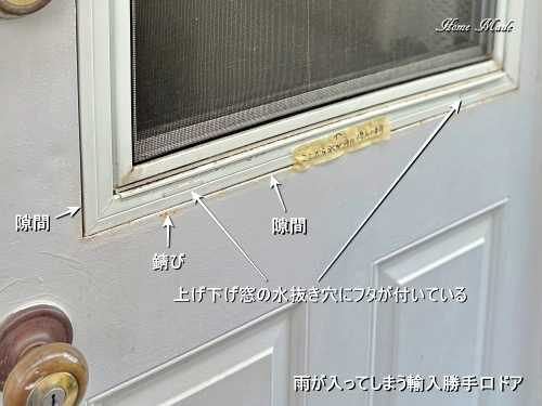 こちらは、先日サッシや天窓のガラス防水処理をさせて頂いた静岡県の輸入住宅に取り付けられている輸入の勝手口ドア。シングルハングの上げ下げ窓が付いているスチールドアですが、こちらのドアにもいくつか問題が発生しているようです。お客様から現場で状況を案内頂いた訳ではないのですが、恐らく窓枠に溜まった雨水が外へ排出されずに室内へ入ってきてしまうのだろうと思います。よく見ないと分からないかも知れませんが、窓の下枠には横長の排水口が2ヶ所設けられているのですが、そのどちらもプラスチックのフタが付いています。こういう場合、ここは水抜きの穴であるべきなんですが、フタが付いていれば窓枠に溜まった水は外へ出ることはありません。窓枠内にどんどん雨水が溜まってくれば、当然水は抜け道を探して室内側へと行ってしまうかも知れません。であれば、水抜き穴のフタを外してしまえばいいじゃないかということになりますが、そうすると強い雨風という場合にそこから雨水が逆に入ってしまうというリスクもあります。ですから、私たちはこのフタを敢えて取らずにフタの下に小さな穴を明けて、水が排水されるようにしながら外からの水の吹込みを極力少ないようにするというやり方をします。(但し、小さなゴミで穴が塞がってしまわないように常にお客様自身で掃除をすることが必要です)そして、樹脂製の窓枠とスチール製のドアとの間に隙間が生じています。こうなると、この隙間からドアの内部に雨水が浸入してしまい、スチールドアを中から錆びさせてしまうというトラブルが発生します。ですから、窓枠の周囲の隙間を防水処理してあげることが必要ですし、その後ドア自体を防水塗装してやらないといけません。そうすることで、勝手口ドアを長く使うことが出来るようになりますし、雨でのトラブルもなくなるはずです。輸入住宅の新築やメンテナンス、コンサルやコーディネートをして欲しい、家全般のチェックやアドバイスを受けたいので、現地調査を希望するという方はお問い合わせ下さい。全国どこでもご相談を受け付けます。尚、相談や問い合わせの前には、日々更新する記事をいくつかご覧の上適否をご判断願います。また、これらの記事が、多くの皆さんのお役に立てて頂ければ幸いです。