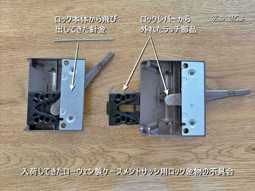 大阪府のお客様から調達を依頼されたロック金物がいくつか入荷しました。取り付ける輸入サッシは、ローウェン(Loewen)社製のケースメントサッシ。ただ、入荷したもののうち、写真の2つに不具合が見付かりました。1つは金物の裏ブタが外れ、その中から細い針金のような部品が飛び出してきました。もう1つは、鍵を引っ掛ける為の黒いラッチ部品がロックレバーから外れていました。こうなると、元に戻したとしてもまた外れてしまいますから、海外メーカーにクレームを言って交換してもらう以外方法はありません。梱包されていた箱にもダメージはありませんでしたし、梱包等のテープを剥がして中を開けられたような形跡もありませんから、出荷よりも前に既に不具合があったと考えるべきです。北米の製品ですし、もしかしたら中国等で製造されたものかも知れませんので、日本のような出荷前検査などはないんでしょうね。ご依頼頂いたお客様には少々お待ち頂く必要がありますが、こういう場合に対応する為に私共のような人間がいるんです。だって、お客様自身で手配したものがこうなっていたとしても、私共のように冷静に対処して問題解決するなんてことは出来ないですもんね。価格ばかりに目を向けるお客様が多いですが、何かあった時の対応やアフターサービス、今後のサポートといった観点から考えれば、私共のような専門家の役割は大きいと思います。輸入住宅の新築やメンテナンス、コンサルやコーディネートをして欲しい、家全般のチェックやアドバイスを受けたいので、現地調査を希望するという方はお問い合わせ下さい。全国どこでもご相談を受け付けます。尚、相談や問い合わせの前には、日々更新する記事をいくつかご覧の上適否をご判断願います。また、これらの記事が、多くの皆さんのお役に立てて頂ければ幸いです。