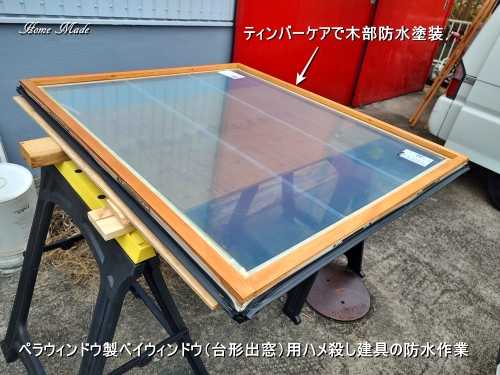 豊橋のお客様からご依頼を頂いたベイウィンドウ(台形出窓)の建具交換。輸入サッシは、ペラウィンドウ(Pella)製のアルミクラッド木製サッシ。写真は、ベイウィンドウの中央に設置する1.2m x 1.1mの大きなFIX(ハメ殺し)建具の木部をティンバーケアで防水塗装している様子です。勿論、屋外側のガラスの周囲も防水処理を施すのですが、ひっくり返すだけでも2人掛かりでないと作業が出来ません。これだけ大きくて重い建具になると、私共が作業車として使っているバネットバンでもギリギリ積めるくらいです。今回の現場は、雨漏れでサッシの木枠が腐ったということで、ベイウィンドウの3枚全ての建具を交換するのですが、その周囲の木枠やカウンターの板も黒くなっているそうですから、外した都合でそういった部分がどうなっているかもチェックしたいと思います。ただ、ベイウィンドウだけでなく、建物の他のサッシもガラスの周囲から雨水が入り込んでいないかも心配しています。こういう雨漏れの問題は、1つの窓だけで済むという話ではないと思います。輸入住宅の新築やメンテナンス、コンサルやコーディネートをして欲しい、家全般のチェックやアドバイスを受けたいので、現地調査を希望するという方はお問い合わせ下さい。全国どこでもご相談を受け付けます。尚、相談や問い合わせの前には、日々更新する記事をいくつかご覧の上適否をご判断願います。また、これらの記事が、多くの皆さんのお役に立てて頂ければ幸いです。