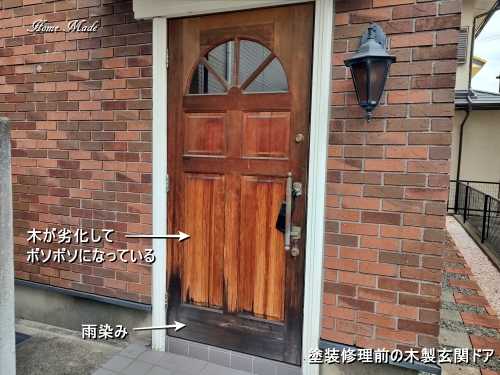 昨日サッシの修理の記事を書かせて頂きましたが、そのおうちで木製の玄関ドアの雨染み補修及び塗装を行いました。メーカーは不明ですが、ハーフサークルウィンドウが付いたオーソドックスなデザインの木製ドアです。修理前の様子は、随分長く雨ざらしになっていた為か、ヒサシがある上部以外の部分は表面の木がボソボソにささくれ立っていたり、雨染みで黒く変色したりしていました。近くの塗装業者さんにも相談をされたそうですが、ここまでいくとドアを交換する以外に方法はないと言われたらしいです。私たち ホームメイドは、丁寧な作業を行う為に2日間掛けて補修工事を行いました。まずは、木の表面に付いた汚れや雨染みを取り除いたり、表面の木をフラットな状態にする為に、番数が異なるサンドペーパーを使いきれいな状態になるまで擦っていきました。勿論、仕事は全て手作業ですから、時間も手間も想像以上に掛かりました。これを機械を使って行う方法もありますが、細かな凹凸部分は拾えないですし、削り過ぎると変な下地の木が見えてきてしまいます。サンドペーパーで下地を作ったら、ハンドル部分等の金物や床に塗料が付かないように養生を行い、着色用の水性塗料で木の質感をアップします。その後、パラペイントの木部専用防水塗料 ティンバーケアを全体に塗布して、雨や太陽の紫外線からドアを保護する作業を行いました。最後に、床からの雨の跳ね返り対策として、アルミ製のキックプレートを装着して、その周囲から水や湿気が入らないように周りを防水処理して作業は完了です。作業の前後の写真を見比べて、その違いがお分かりでしょうか?輸入住宅の新築やメンテナンス、コンサルやコーディネートをして欲しい、家全般のチェックやアドバイスを受けたいので、現地調査を希望するという方はお問い合わせ下さい。全国どこでもご相談を受け付けます。尚、相談や問い合わせの前には、日々更新する記事をいくつかご覧の上適否をご判断願います。また、これらの記事が、多くの皆さんのお役に立てて頂ければ幸いです。