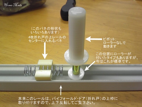 10月25日にバイフォールド・ドア用のピボットという部品についてご案内しましたが、今主流となっているピボットは、こちらの写真。昔はピボットの先に、ガイドレールを走る為のローラー部品が付いていたんですが、今はわざわざローラーを用いないでガイドレールの溝に差し込むだけのものになっています。勿論、レールをスムースに動くように、プラスチックの白い頭が取り付けられているのですが・・・。まあ、こうした単純な部品の方が壊れにくいから、日本に輸入される折れ戸の部品も変わってきたんでしょうね。ただ、アメリカでは、ローラータイプもバネ組み込み型タイプも併用して売られています。北米でしか手に入らないこうしたタイプを無理に購入するより、代替え可能な標準部品に交換する方が賢い選択かも知れません。そうした方が、早く手に入って、お値打ちですしね。メンテナンスのやり方や交換部品の入手先さえ分かっていれば、誰でも簡単に点検・修理出来てしまうのが輸入住宅です。私のような輸入住宅のプロが近くにいないようなら、いつでも連絡して頂いて結構です。儲けはありませんが、お力になりますよ。