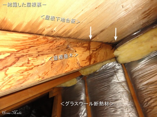 アルミクラッドの木製輸入サッシなのに、ガラス付近が結露を起すという輸入住宅にお住まいのお客様から、屋根裏の状況写真を撮ってもらいました。屋根を支える屋根垂木(たるき)と呼ばれる材木と屋根材の下地となっている構造用合板と接する部分に黒い染みが出来ているのが分かりますか。また、垂木には水が流れたような跡がありますし、垂木の一番高いところが更に黒く変色している状況です。こうした状況は、普通雨漏りと判断しがちですが、実際は室内の暖かい湿気のある空気が屋根裏まで上昇して、寒い冬の屋根付近で水分に変化することで発生する結露の場合が殆どです。その証拠に夏場はいくら湿気が多い空気であっても、屋根裏が水(雨)で濡れている状況はありません。(湿気でジメジメはしていますが・・・)こういう場合、暖かい空気を外に放出できる換気棟を必要量設置することで解消することが可能です。ただ、このおうちの場合、グラスウールの断熱材が密閉された袋に入っていない露出した状況ですから、湿気や水分が入って使い物にならないかも知れません。恐らくこの断熱材は、24時間の換気装置を屋根裏の熱からカバーする為に設置されたもののように思いますが、アルミの気密袋に入れる意味がなくなっています。まあ、私たちならセルロースや天然羊毛を断熱材に使いますから、吸放湿作用を働かせる為に逆に断熱材を極力露出させますが・・・。何れにしても、このまま屋根裏の結露を放置すれば、合板や垂木、断熱材が傷んでしまい、交換を余儀なくされますから、早めに対策をしなければなりません。こういう住宅は、実は日本に相当多いというふうに思っていますので、機会があれば小屋裏を覗いてチェックして下さい。この問題は、木造でも軽量鉄骨でも起こります。今なら染み程度の汚れだけで済むかも知れませんよ。お困りの方は、お問い合わせ下さい。