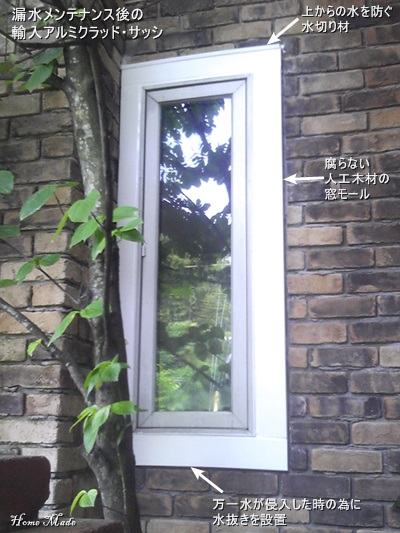 以前レンガ・タイル(カルチャード・ブリック)を張った輸入住宅に取り付けられた輸入のアルミクラッド・サッシのまわりで長年漏水していたのが原因で、シロアリまで発生していたという記事を書きました。その後、シロアリ及び黒アリを駆除した上で、窓の復旧が完了しましたので、お知らせします。写真で見て分かる通り、何事もなかったかのような窓の外観ですよね。窓の木枠の腐れや虫食いは、結構なものでしたが、表面的に損傷しているのが分からないという状況でしたので虫食いの補強や駆除をしっかりした上で、そのまま元の窓を使いました。原因は、窓の周囲のレンガ・タイルにクラックは入っていたり接着剤のモルタルから水が染み込んで中に入り込んだことです。ですから、本来であればカルチャード・ブリックを全部剥がして防水施工をやり直すのが一番ですが、予算や大掛かりな工事となることを避けたいお客様の要望もあって、最低限今後窓に損傷が発生しないように一時しのぎの工事を行いました。つまり、水が窓の上や横から入らないように水切りを入れたり防水紙を回したりしてリスクを軽減し、腐らない人工木材で下地や化粧をすることで、万一水が入っても大丈夫なようにしてあります。また、万一入った際でも水が抜けていくように、水抜きも作ってありますから、窓に関しては問題が発生しにくい状態に出来たと思います。ただ、これは本当に今やれる最低限のことですから、カルチャード・ブリックの外壁に問題が発生した際には、完璧にやり直すことが求められます。関連記事: 外壁(外装)材の直貼りは、リスクが高い(2)