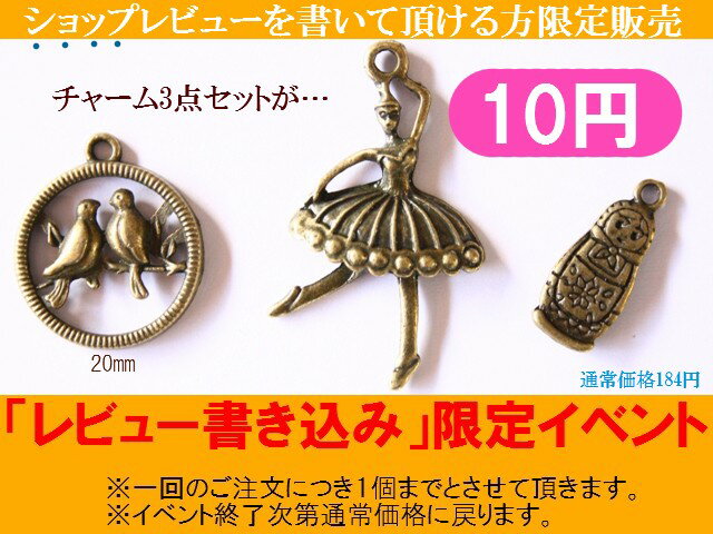 販売中♪ レビュー書き込みイベント!!! チャーム3個セット10円!! メール便80円OK♪ チャーム3個10円!!! レビュー書き込みイベント!お試し商品★メタルチャーム★3個セットが10円!アンティーク型のアクセサリーチャーム「通常184円が特別なんと!10円です」