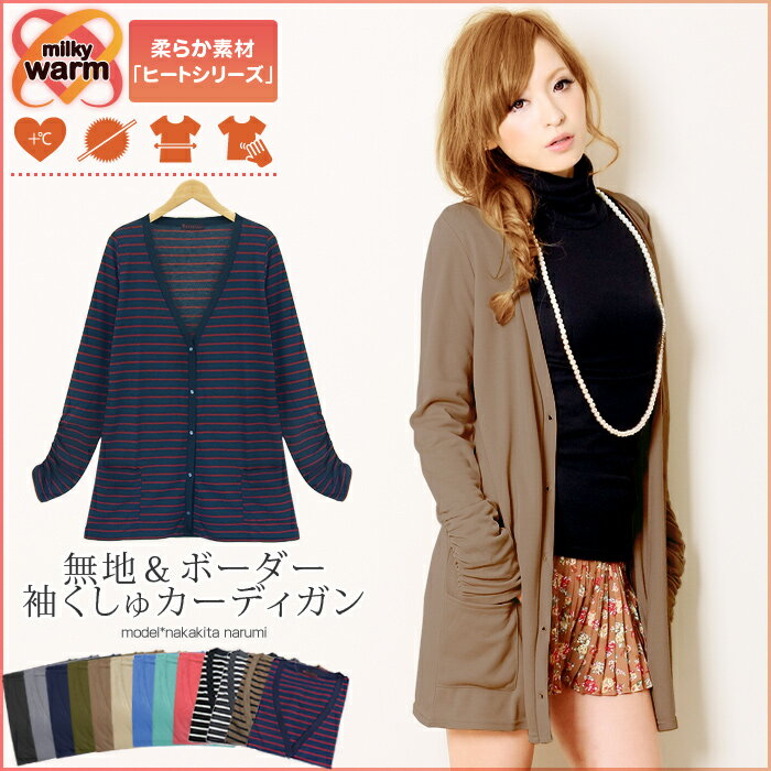 0時~販売!! 袖くしゅVネック薄起毛カーディガン送料込880円!!! ボーダーのネイビーがかわいい♪ 【優勝記念☆限定!送料無料×880円】★★☆【milky warm】袖くしゅVネック薄起毛カーディガン☆シャーリング ミルキーウォーム V首 羽織り 長袖 裏起毛 あったか ヒート カットソー M L【返品不可】(メール便配送・代引不可)