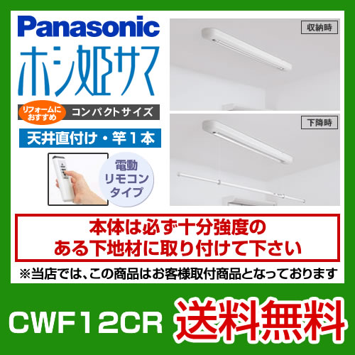 ■商品名:ホシ姫サマ[CWF12CR]【送料無料】カード払いOK!パナソニック【室内物干し】ユニット(リモコン電動 天井直付けタイプ)※ホシ姫サマの取付工事はお受けできません【干し姫様】■レビュアー:オレンジミント7272 ※投稿時■レビュー内容年老いた母が肩をこわし、洗濯物干しが大変そうだったので購入しました。取り付けはちょっと大変でしたが、2人で天井を見上げながら格闘し、なんとか素人でもできました。取り付けまでされる方は同店で紹介されている「下地探し・どこ太」を一緒に購入されることをお勧めします。これのおかげで、下地のしっかりした場所に取り付けることができました。取り付け場所は、居間のエアコンの前。乾いた風が洗濯物のおかげで適当な… もっと詳しく見る
