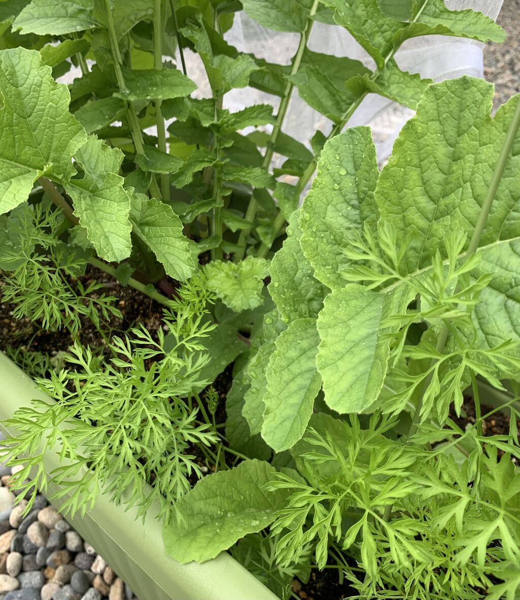 ミニ大根は葉っぱが大きい!コンパニオンプランツのニンジンがタジタジしてます。
