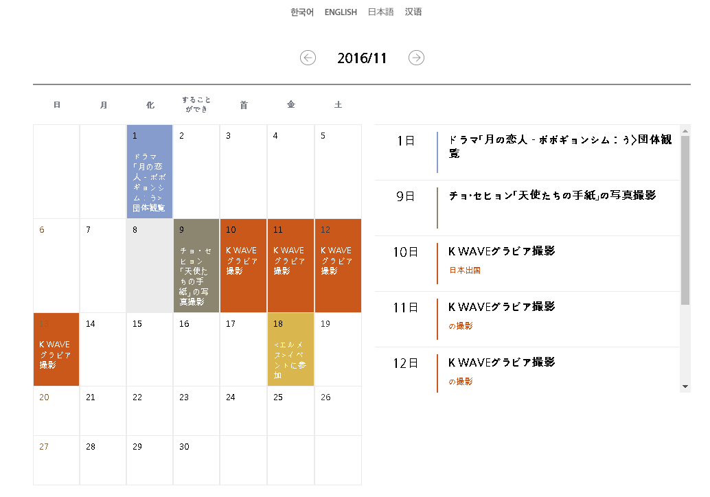 ↓の方に載せましたが、嬉しい記事ですね。この記事は画像もいいです。スケジュールでは台湾公演の日程が変更になったと、韓国公式に載りましたね。1月20日→1月8日に変更だそうです。11月も撮影などのスケジュールが入りました。チョ・セヒョンさんの「天使たちの手紙」に参加するんですね。これは養子縁組制度の普及のために、写真家のチョ・セヒョンさんがスターと赤ちゃんの写真展をするものです。子供好きなジュンギくん&赤ちゃん、楽しみです。雑誌はK-WAVE、3日も撮影するなんて大々的に取り上げてくれるんですね。10日に日本出国と書いてあるのですが、日本で撮影?【終わっていない熱風...イ・ジュンギ、TV出演、話題性1位】osen 2016.11.8俳優イ・ジュンギがTV出演、話題性1位を占めた。8日TV話題性の分析機関グッドデータコーポレーションが発表した内容によると、一週間TV出演者問題/話題性調査の結果、ドラマ部門1位をイ・ジュンギが占めた。非ドラマ部門1位は、JTBC「ソルジョン」ユ・シミンが上がった。先週の火曜日に放映終了したSBSドラマ「月の恋人-歩歩驚心麗」の嵐のような人気に支えられたもので、イ・ジュンギのドラマを通じてカリスマと繊細な感情演技の両方を披露し、いまだに好評を博している。だけでなく、「月の恋人」が、中国、香港、台湾など中華圏をはじめ、北米、欧州でも人気を集めており、イ・ジュンギがグローバル大勢のランナーに選ばれている。 ドラマ放映終了後、イ・ジュンギは来る12月3日、ソウルで始まるアジアツアー準備に本格的に突入する。イ・ジュンギの所属事務所ナムアクターズは今週内にソウル公演チケットのスケジュールをイ・ジュンギ公式ホームページと所属事務所のホームページに発表する予定である。 ナムアクターズ関係者は、「複数の世論調査でイ・ジュンギが強気を見せている。大衆の愛に感謝している。俳優もとても感動受けアジアツアーなどのスケジュールに最善を尽くして参加し、ファンの皆さんの愛し報いるという覚悟だ」と付け加えた。イ・ジュンギのアジアツアーはソウル、日本、台湾公演が確定されており、この以外の地域につきましては、現在も議論している。世界各国のファンからファンミーティングの要求を受けており、苦心しているという裏話だ。