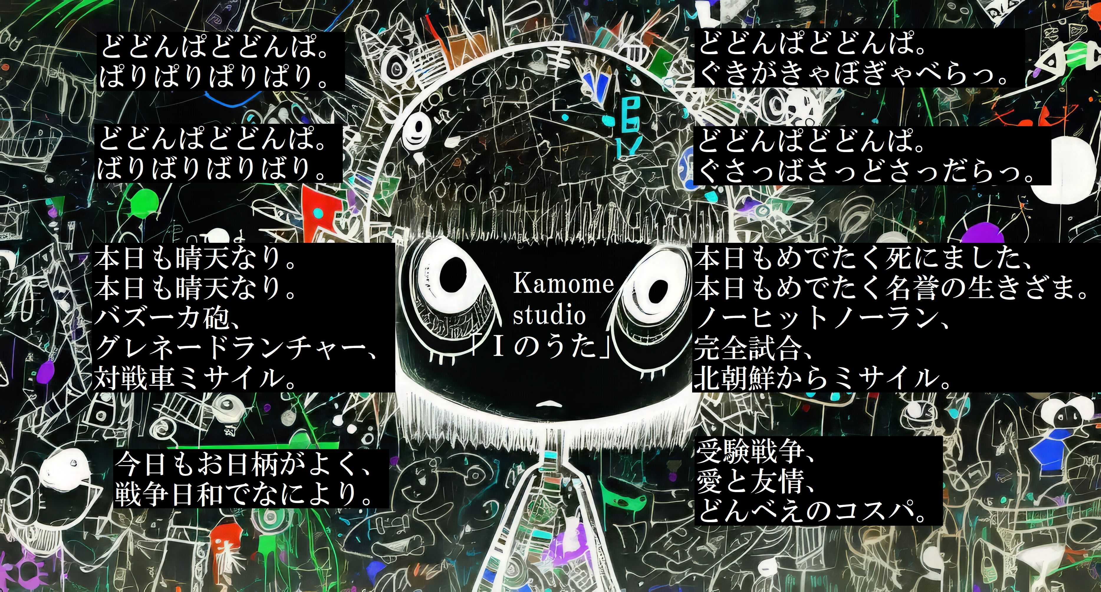 Iのうたどどんぱどどんぱ。ぱりぱりぱりぱり。どどんぱどどんぱ。ばりばりばりばり。本日も晴天なり。本日も晴天なり。バズーカ砲、グレネードランチャー、対戦車ミサイル。今日もお日柄がよく、戦争日和でなにより。どどんぱどどんぱ。ぐきがきゃぼぎゃべらっ。どどんぱどどんぱ。ぐさっばさっどさっだらっ。本日もめでたく死にました、本日もめでたく名誉の生きざま。ノーヒットノーラン、完全試合、北朝鮮からミサイル。受験戦争、愛と友情、どんべえのコスパ。