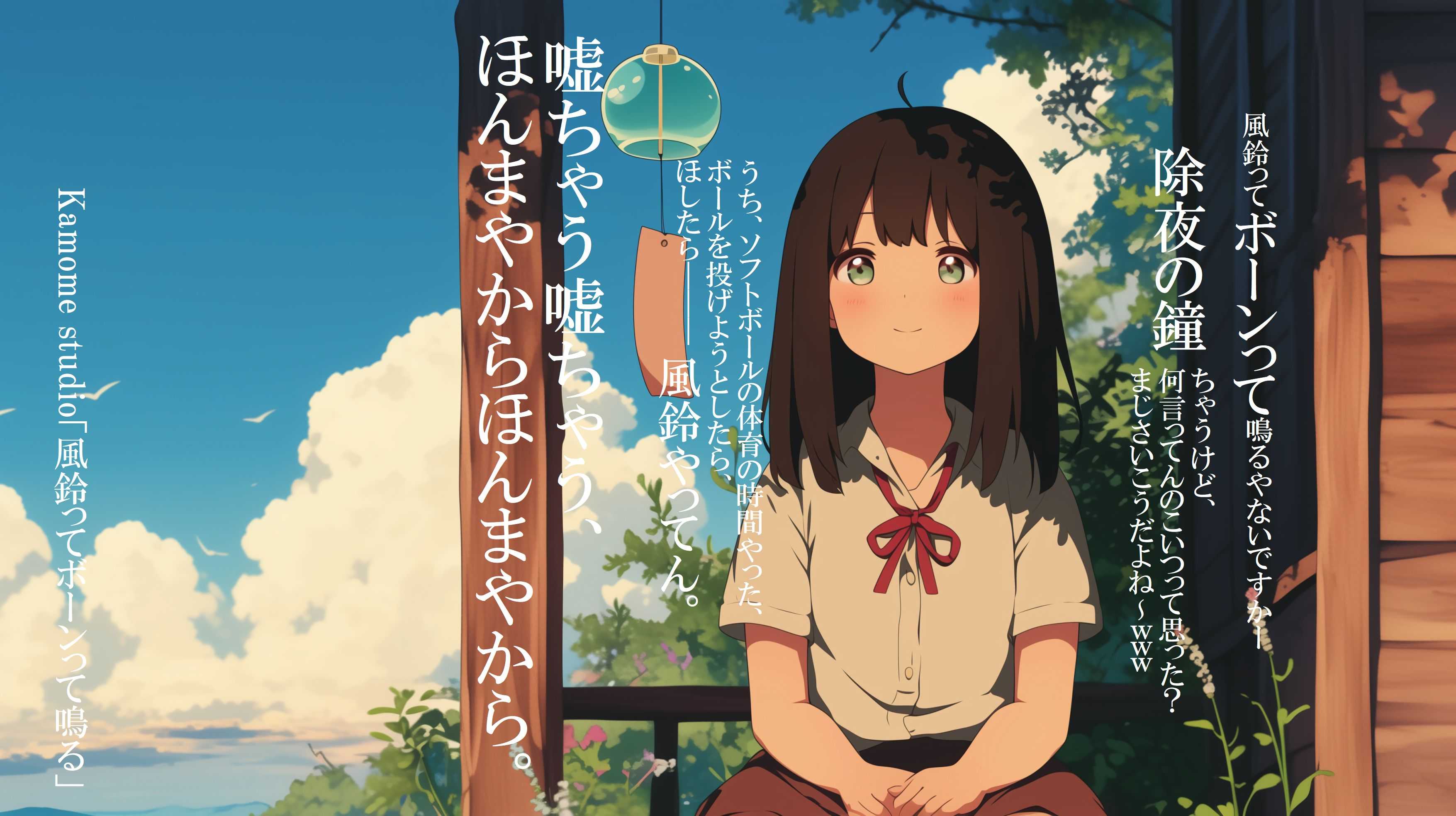 風鈴ってボーンって鳴る風鈴ってボーンって鳴るやないですかー。除夜の鐘ちゃうけど、何言ってんのこいつって思った?まじさいこうだよね~wwwうち、ソフトボールの体育の時間やった、ボールを投げようとしたら、ほしたら―――風鈴やってん。嘘ちゃう嘘ちゃう、ほんまやからほんまやから。梅干しみたいに、ガッっていきたい、形ですねー、ふふふ( *´艸`)やめてよやめてよ、食べられたくない―――猟奇的趣味。世紀末のギロチンショー、そして煮え立つ蝉しぐれ、夏ですねー、夏でありまんがな。そんなきつい関西弁もうないやろ。あの、一人ボケツッコミ、風鈴って風林火山じゃないですかー。ちりんちりんって鳴ってるんですよー、あはは、あはは―――あぁアァあぁアァ・・。知らんがな、知らんがな、―――退屈だなー、アヒャ(*´Д`)でも小耳に挟んだですよね、近頃風鈴さんが、おにぎりに握られてしまうって、ね。嘘ちゃう嘘ちゃう、ほんまやからほんまやから。