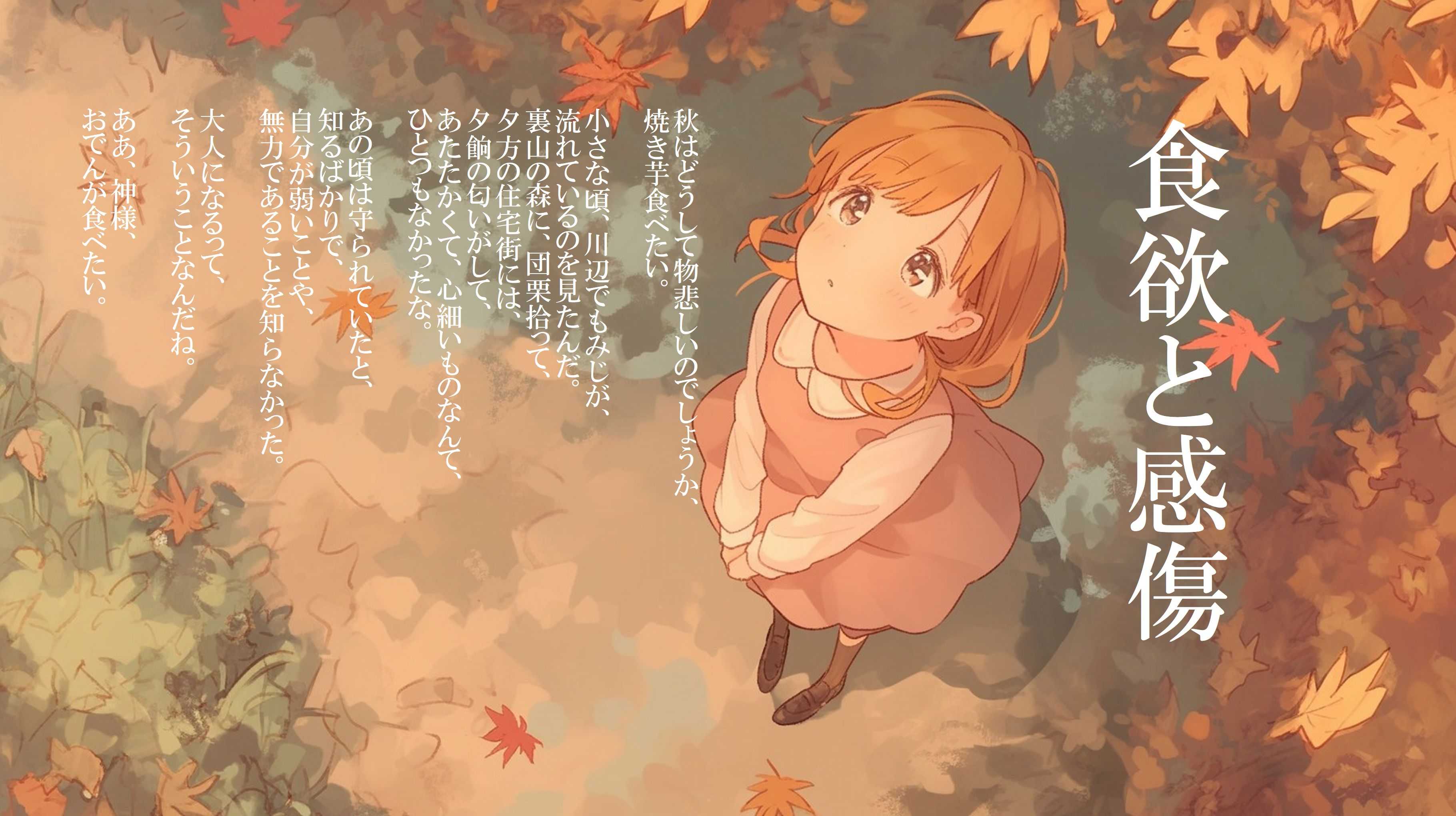 食欲と感傷秋はどうして物悲しいのでしょうか、焼き芋食べたい。小さな頃、川辺でもみじが、流れているのを見たんだ。裏山の森に、団栗拾って、夕方の住宅街には、夕餉の匂いがして、あたたかくて、心細いものなんて、ひとつもなかったな。あの頃は守られていたと、知るばかりで、自分が弱いことや、無力であることを知らなかった。大人になるって、そういうことなんだね。ああ、神様、おでんが食べたい。
