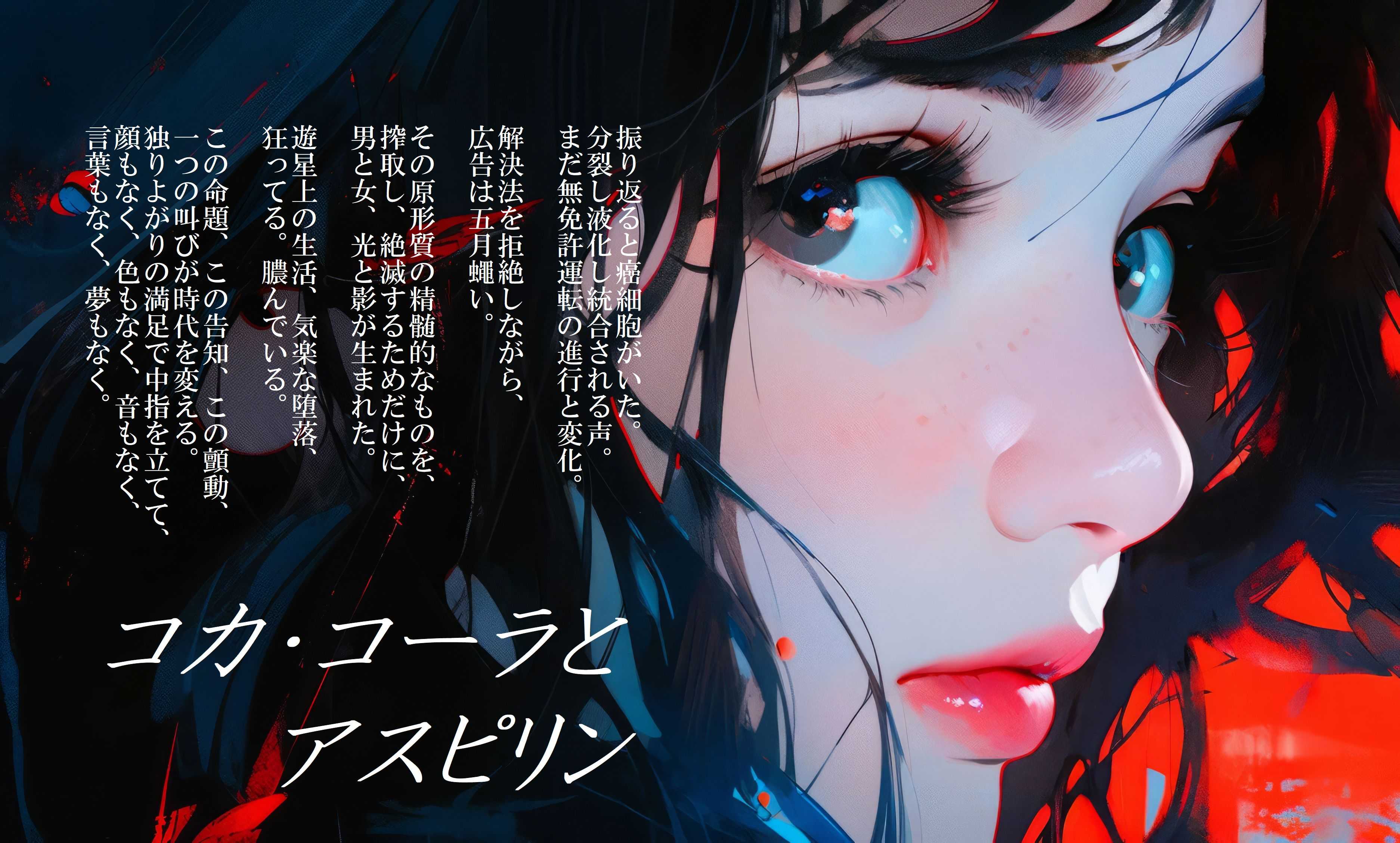 コカ・コーラとアスピリン振り返ると癌細胞がいた。分裂し液化し統合される声。まだ無免許運転の進行と変化。解決法を拒絶しながら、広告は五月蠅い。その原形質の精髄的なものを、搾取し、絶滅するためだけに、男と女、光と影が生まれた。遊星上の生活、気楽な堕落、狂ってる。膿んでいる。この命題、この告知、この顫動、一つの叫びが時代を変える。独りよがりの満足で中指を立てて、顔もなく、色もなく、音もなく、言葉もなく、夢もなく。