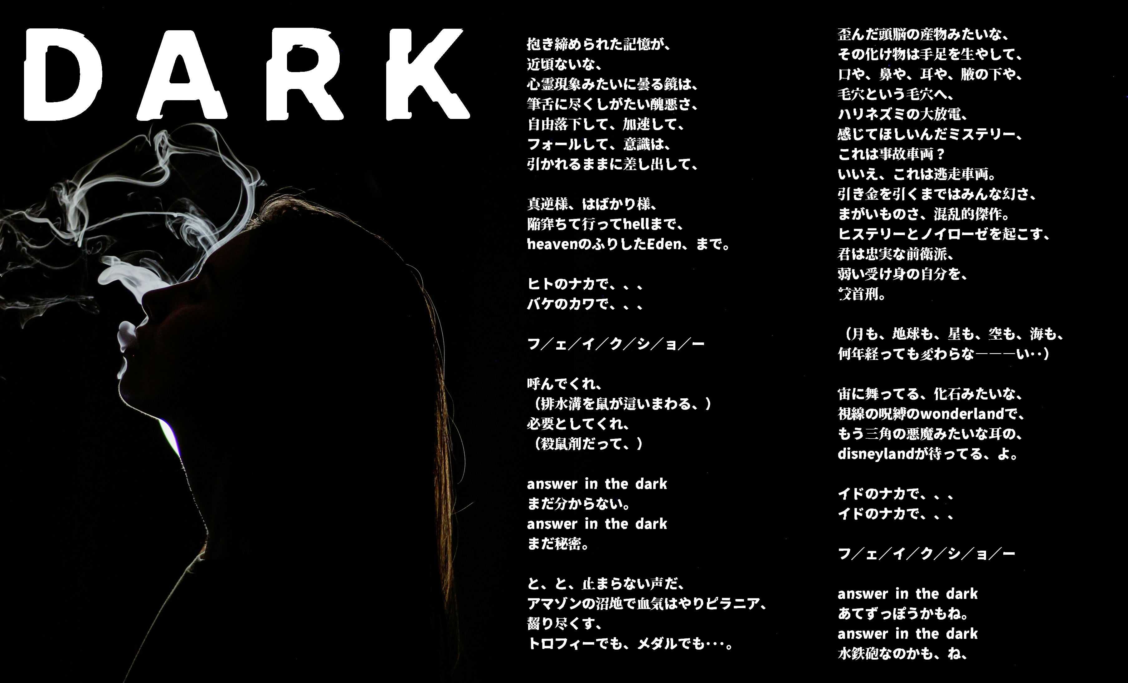 DARK抱き締められた記憶が、近頃ないな、心霊現象みたいに曇る鏡は、筆舌に尽くしがたい醜悪さ、自由落下して、加速して、フォールして、意識は、引かれるままに差し出して、真逆様、はばかり様、陥穽ちて行ってhellまで、heavenのふりしたEden、まで。ヒトのナカで、、、バケのカワで、、、フ/ェ/イ/ク/シ/ョ/ー呼んでくれ、(排水溝を鼠が這いまわる、)必要としてくれ、(殺鼠剤だって、)answer in the dark まだ分からない。answer in the darkまだ秘密。と、と、止まらない声だ、アマゾンの沼地で血気はやりピラニア、齧り尽くす、トロフィーでも、メダルでも・・・。歪んだ頭脳の産物みたいな、その化け物は手足を生やして、口や、鼻や、耳や、腋の下や、毛穴という毛穴へ、ハリネズミの大放電、感じてほしいんだミステリー、これは事故車両?いいえ、これは逃走車両。引き金を引くまではみんな幻さ、まがいものさ、混乱的傑作。ヒステリーとノイローゼを起こす、君は忠実な前衛派、弱い受け身の自分を、絞首刑。(月も、地球も、星も、空も、海も、何年経っても変わらな―――い・・)宙に舞ってる、化石みたいな、視線の呪縛のwonderlandで、もう三角の悪魔みたいな耳の、disneylandが待ってる、よ。イドのナカで、、、イドのナカで、、、フ/ェ/イ/ク/シ/ョ/ーanswer in the dark あてずっぽうかもね。answer in the dark水鉄砲なのかも、ね、