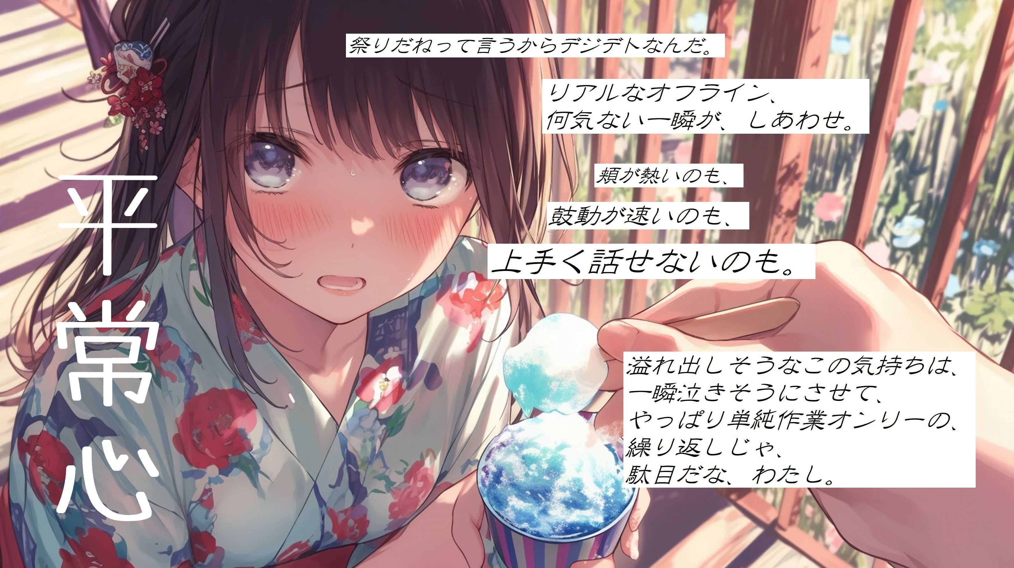 平常心祭りだねって言うからデジデトなんだ。リアルなオフライン、何気ない一瞬が、しあわせ。頬が熱いのも、鼓動が速いのも、上手く話せないのも。溢れ出しそうなこの気持ちは、一瞬泣きそうにさせて、やっぱり単純作業オンリーの、繰り返しじゃ、駄目だな、わたし。