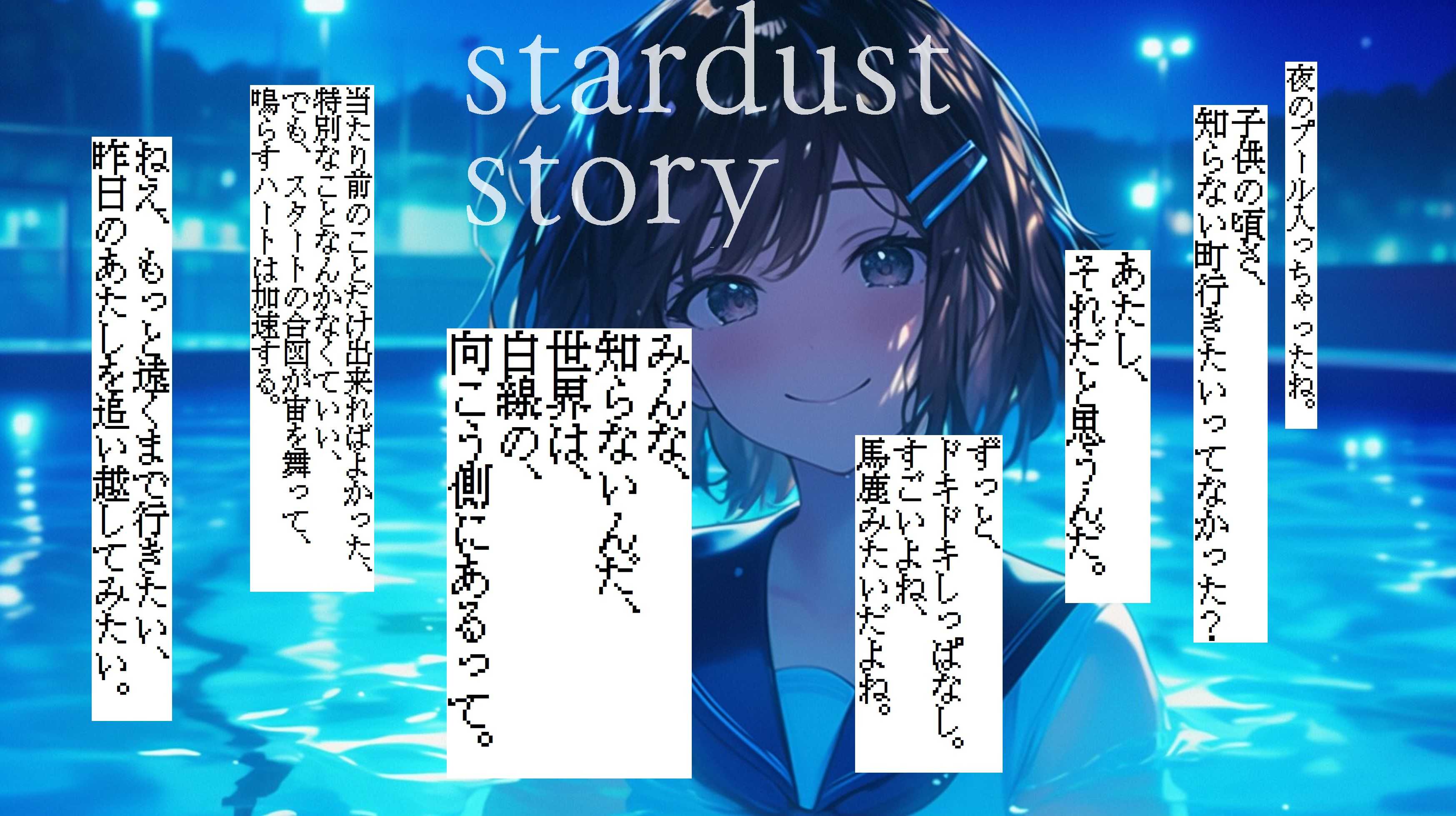 stardust story夜のプール入っちゃったね。子供の頃さ、知らない町行きたいってなかった?あたし、それだと思うんだ。ずっと、ドキドキしっぱなし。すごいよね、馬鹿みたいだよね。みんな、知らないんだ、世界は、白線の、向こう側にあるって。当たり前のことだけ出来ればよかった、特別なことなんかなくていい、でも、スタートの合図が宙を舞って、鳴らすハートは加速する。ねえ、もっと遠くまで行きたい、昨日のあたしを追い越してみたい。